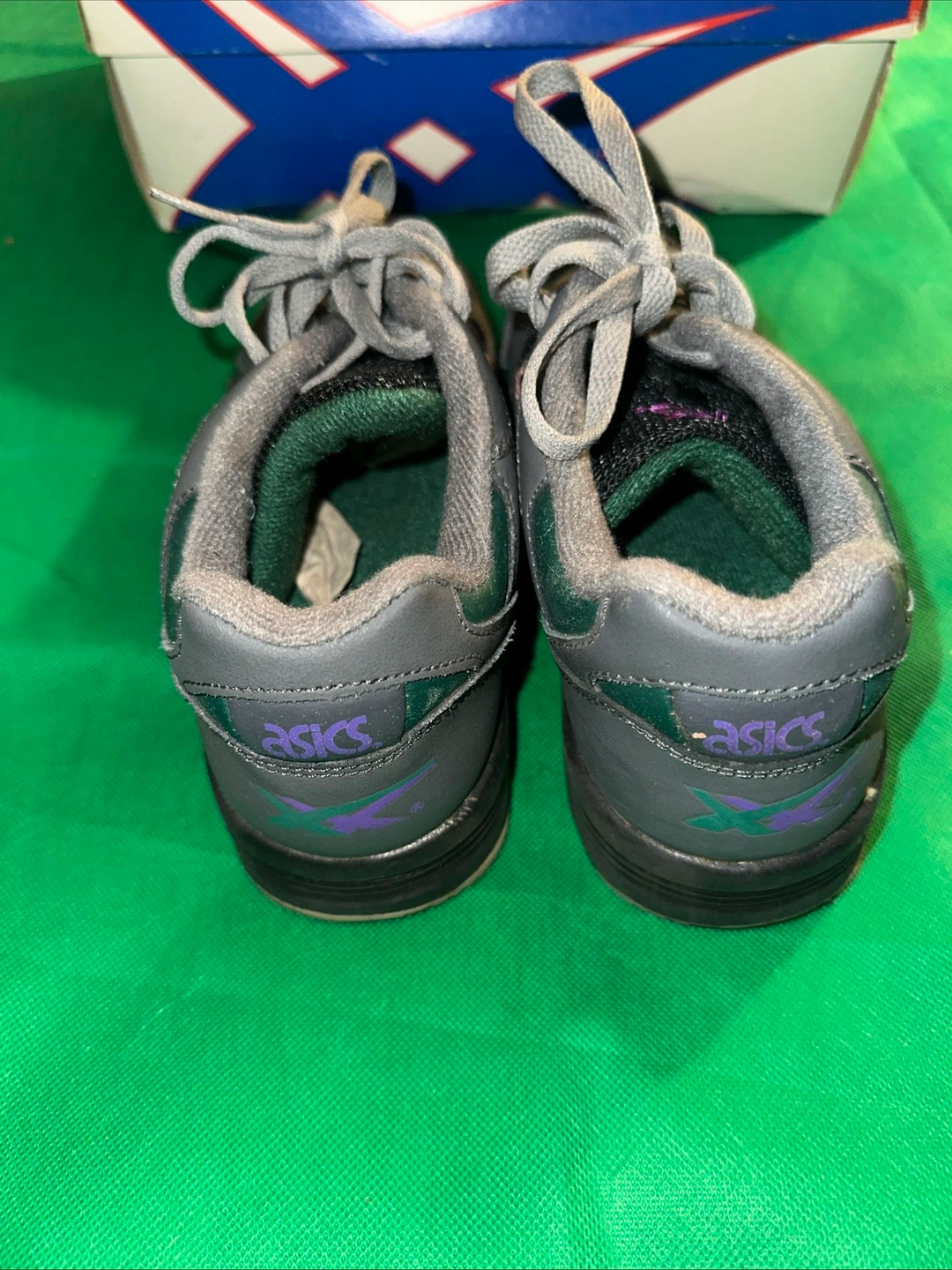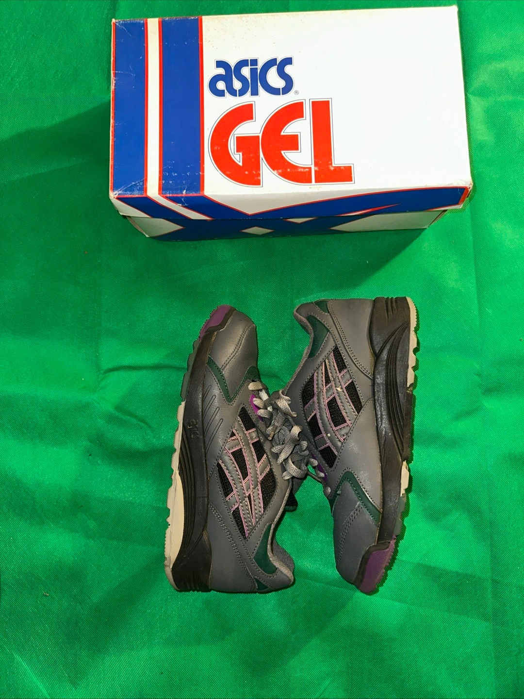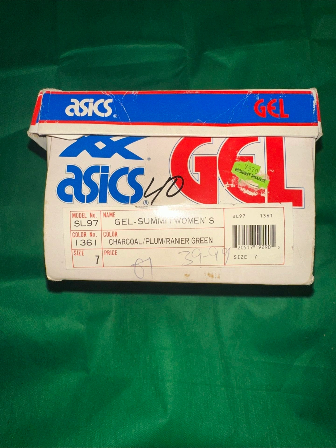 These are vintage, 90s-era Asics running shoes, model SL97, in the Charcoal/Plum/Ranier Green colorway. They are size 7 and come with the original box. Feel free to message if you have any questions!