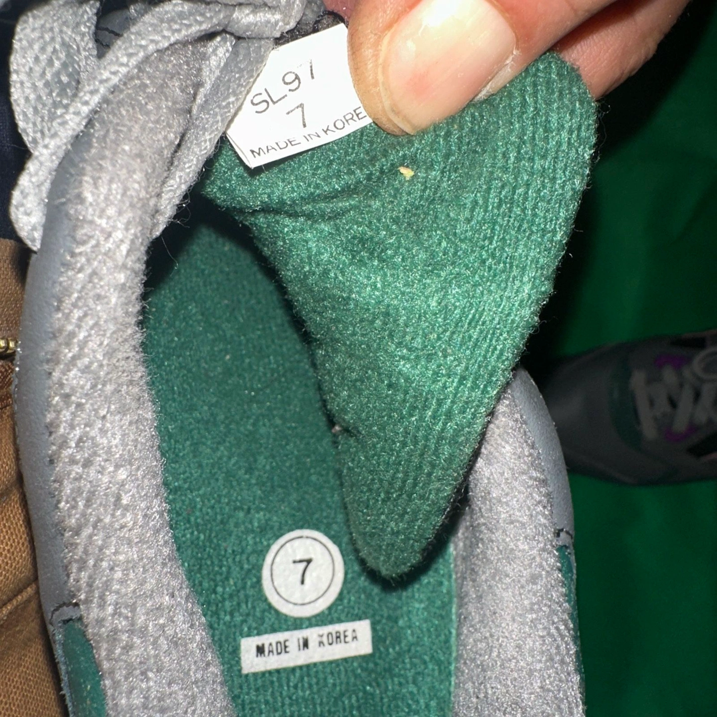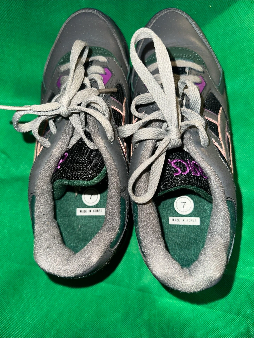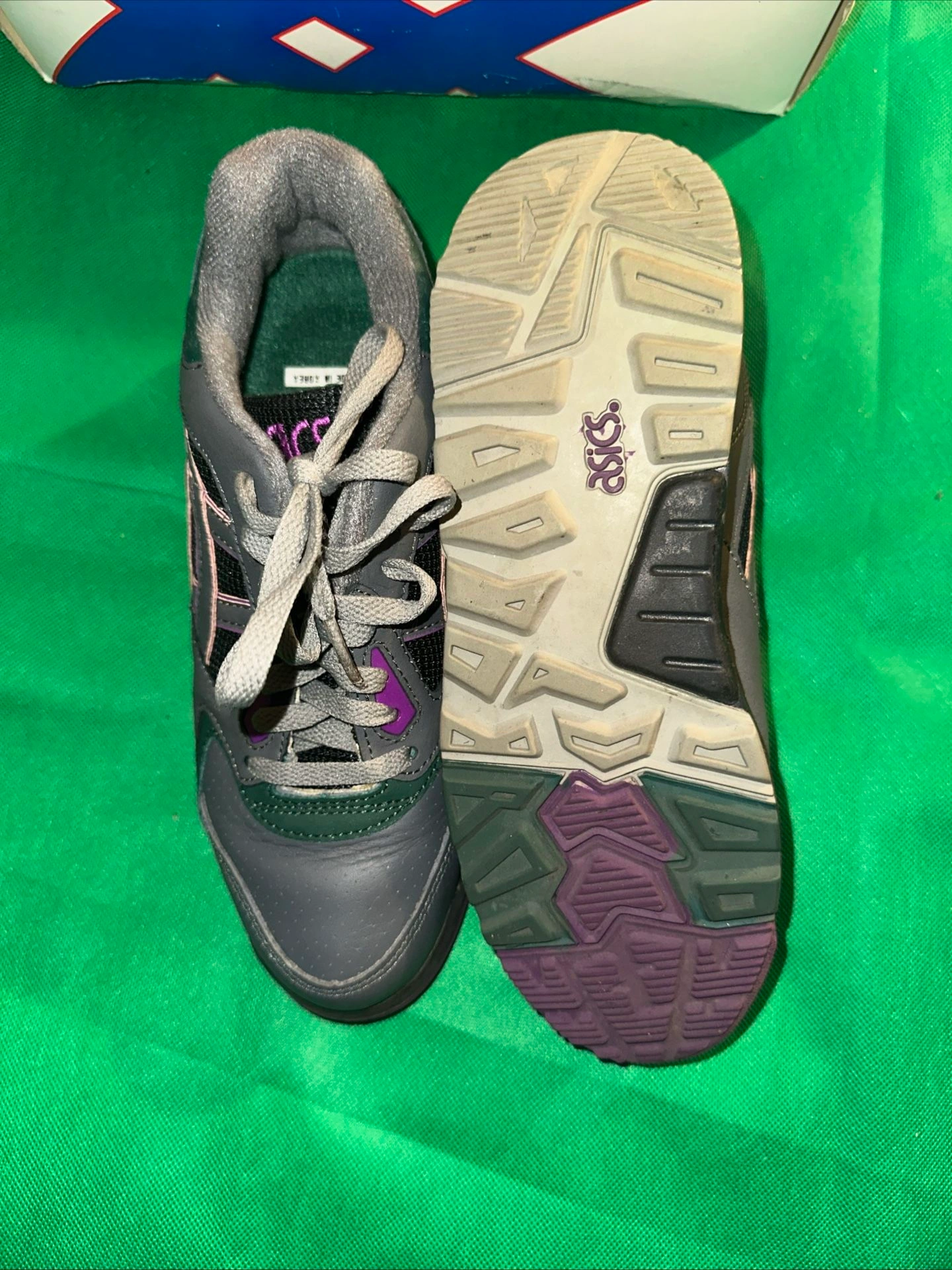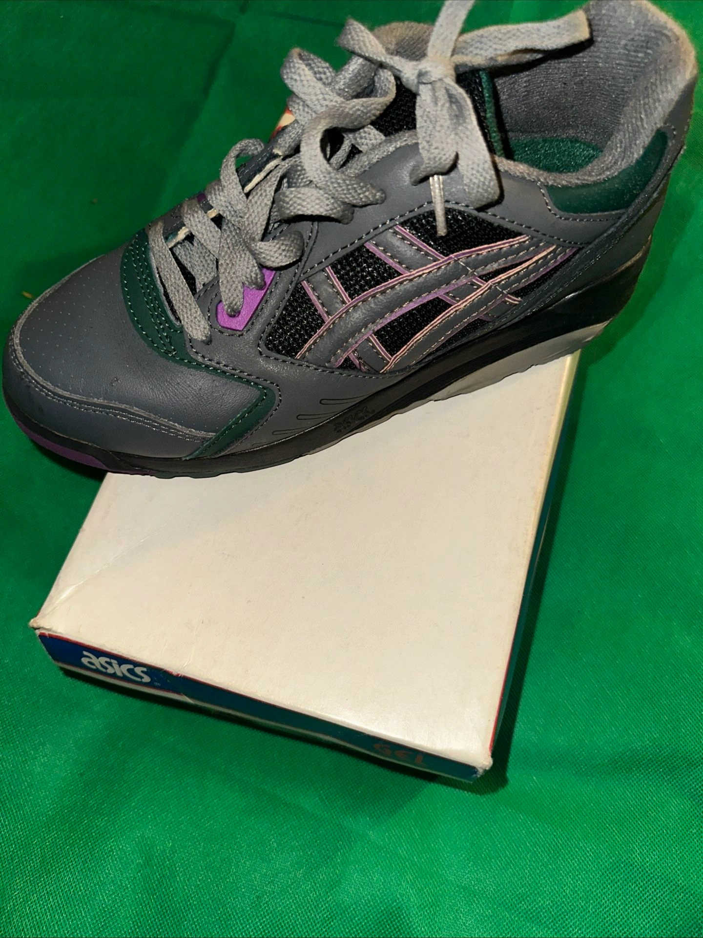These are vintage, 90s-era Asics running shoes, model SL97, in the Charcoal/Plum/Ranier Green colorway. They are size 7 and come with the original box. Feel free to message if you have any questions!