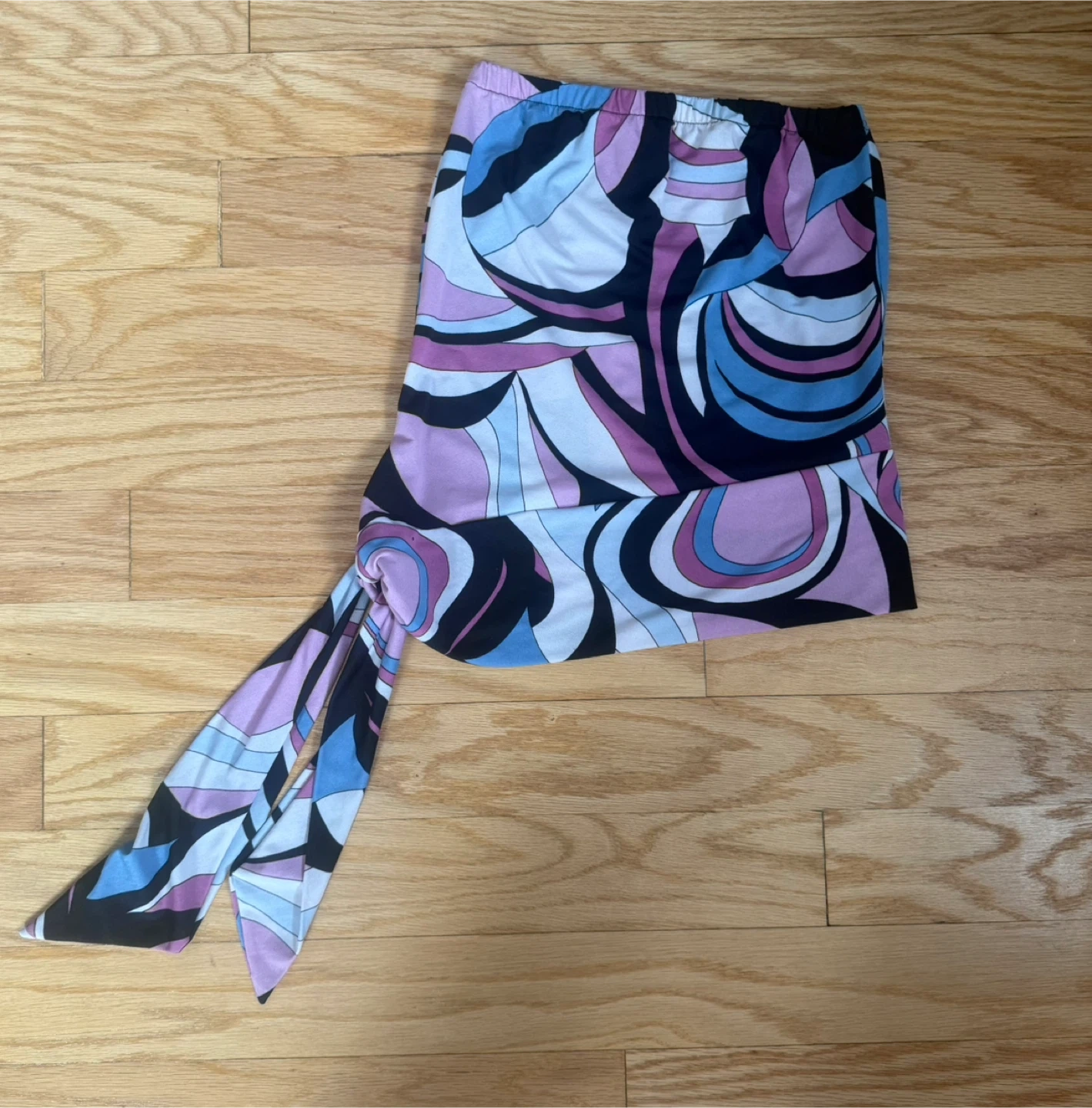 This tube top features a bold geometric print in pink, blue, and black. It has a strapless design with a tie detail at the front. Material is a stretchy blend.
