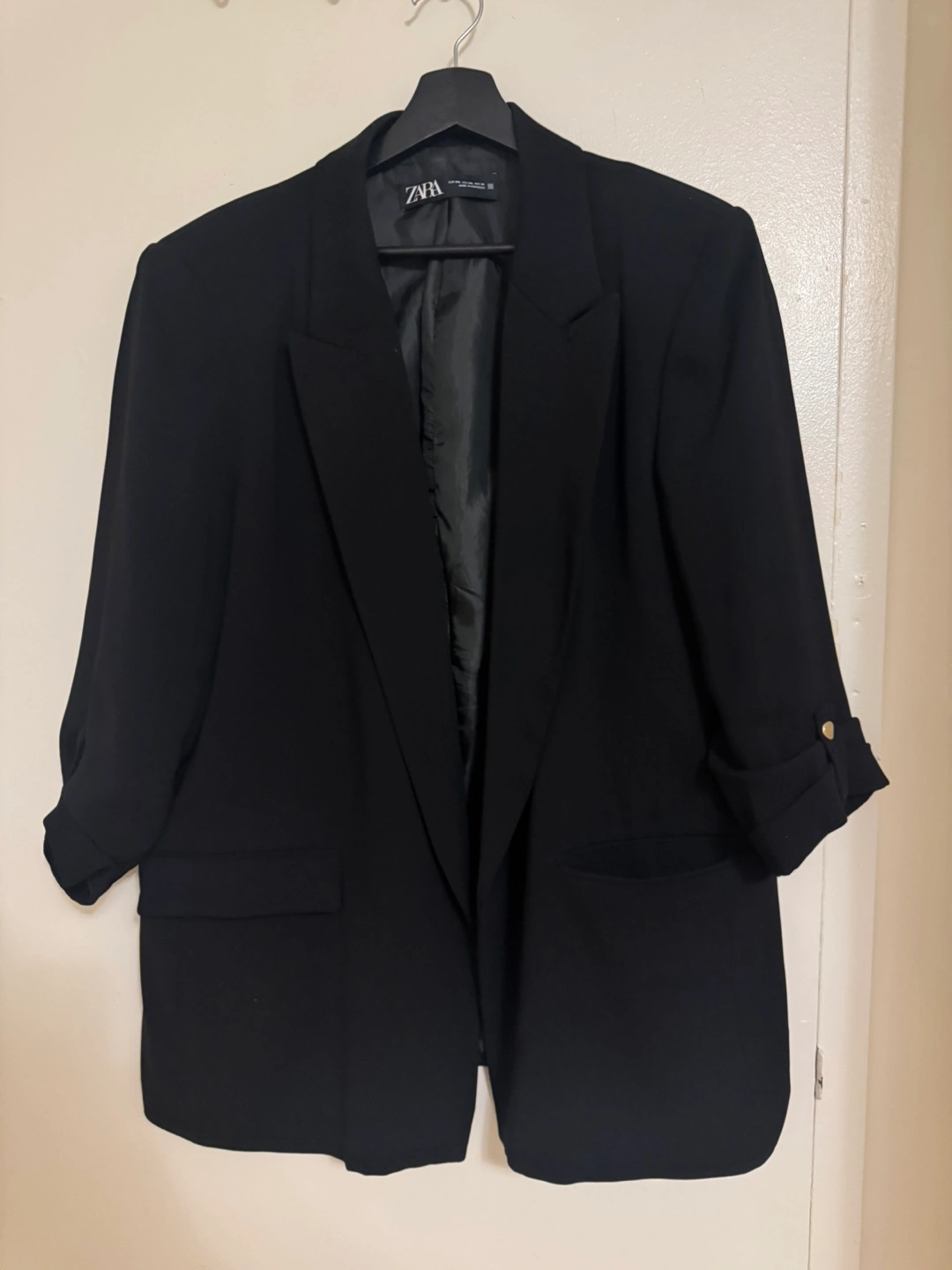Women's black blazer. Open front. Lapel collar. Shoulder pads. Below-elbow length. Cuffed sleeves with gold button tabs. Front flap pockets. Excellent condition. Include Zara cover