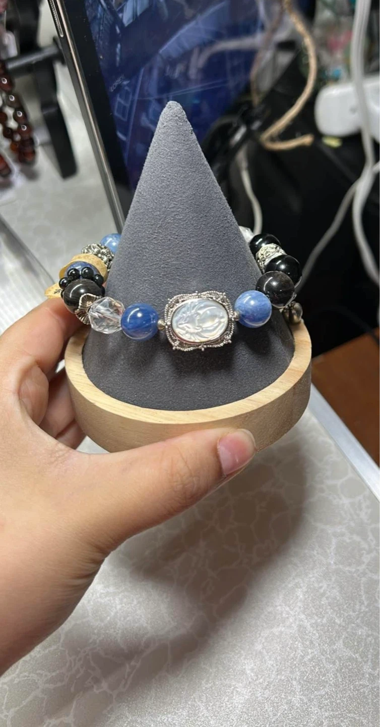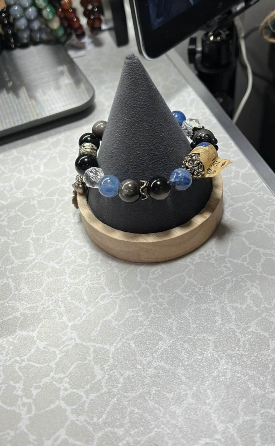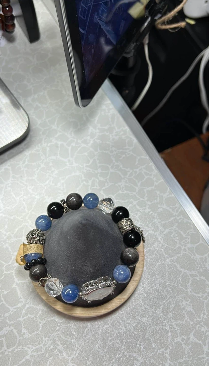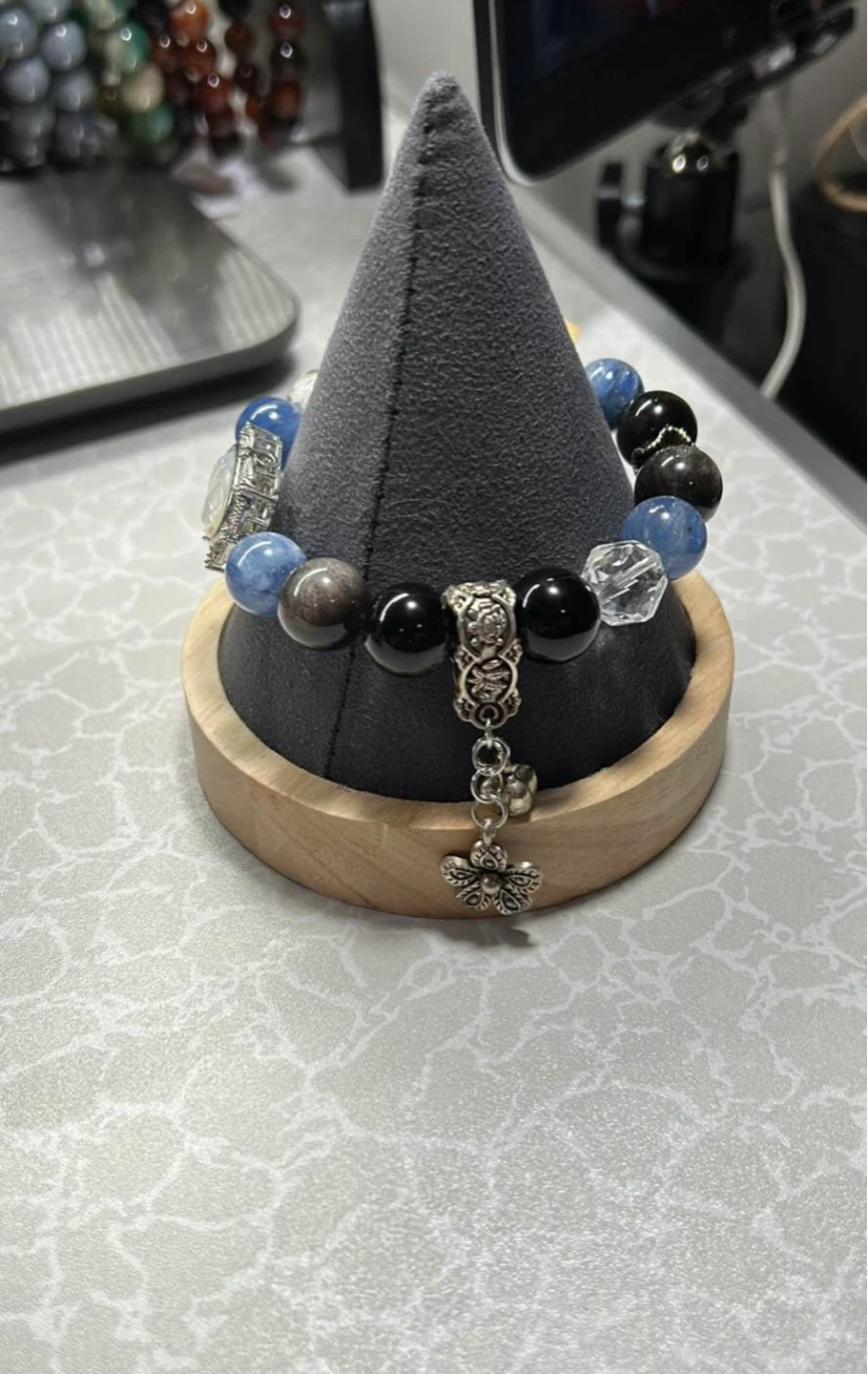 This is a stretch bracelet featuring a mix of natural stones like kyanite, obsidian, and clear quartz. It's accented with silver-tone spacers and a decorative charm. It's a unique accessory!