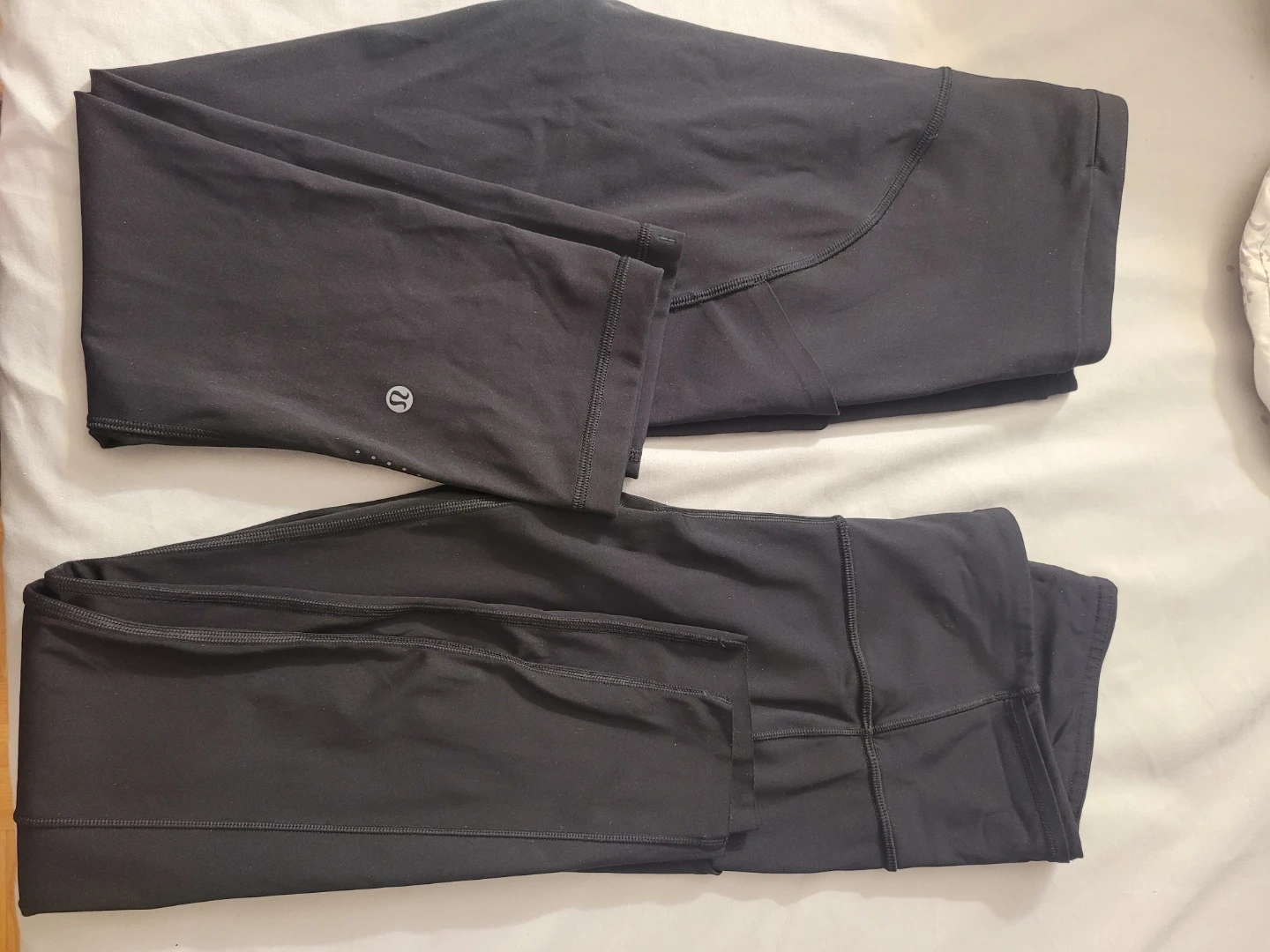 These are Lululemon black leggings. They're made of a stretchy fabric. They're good for athletic activities.