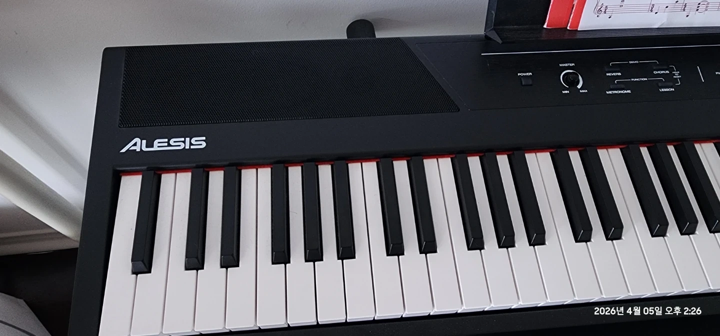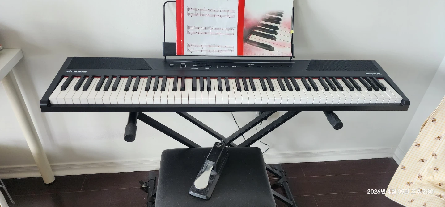 This is an Alesis Recital digital piano, a great starter instrument. It's in black and includes a music stand and pedal. Perfect for learning to play!