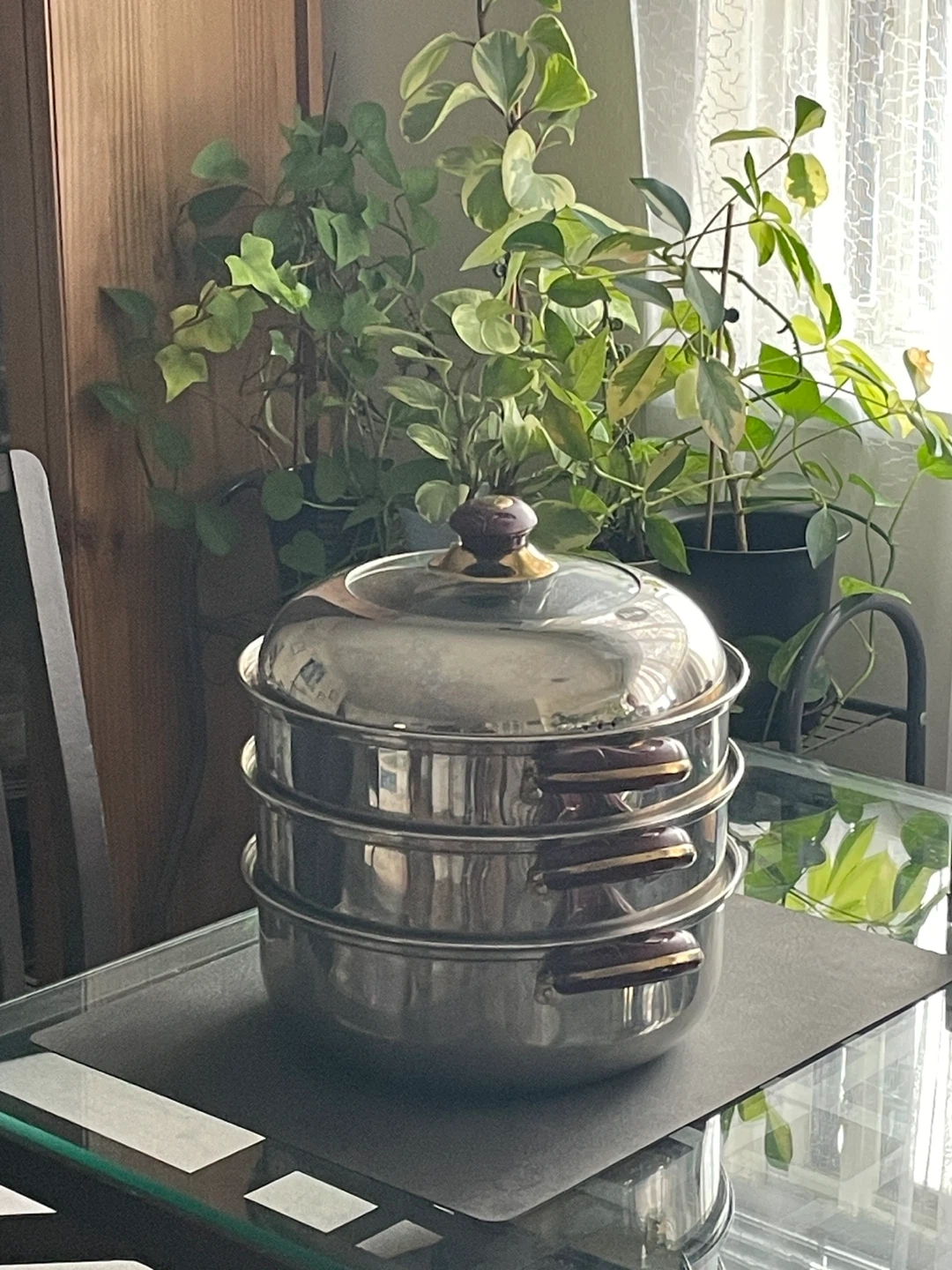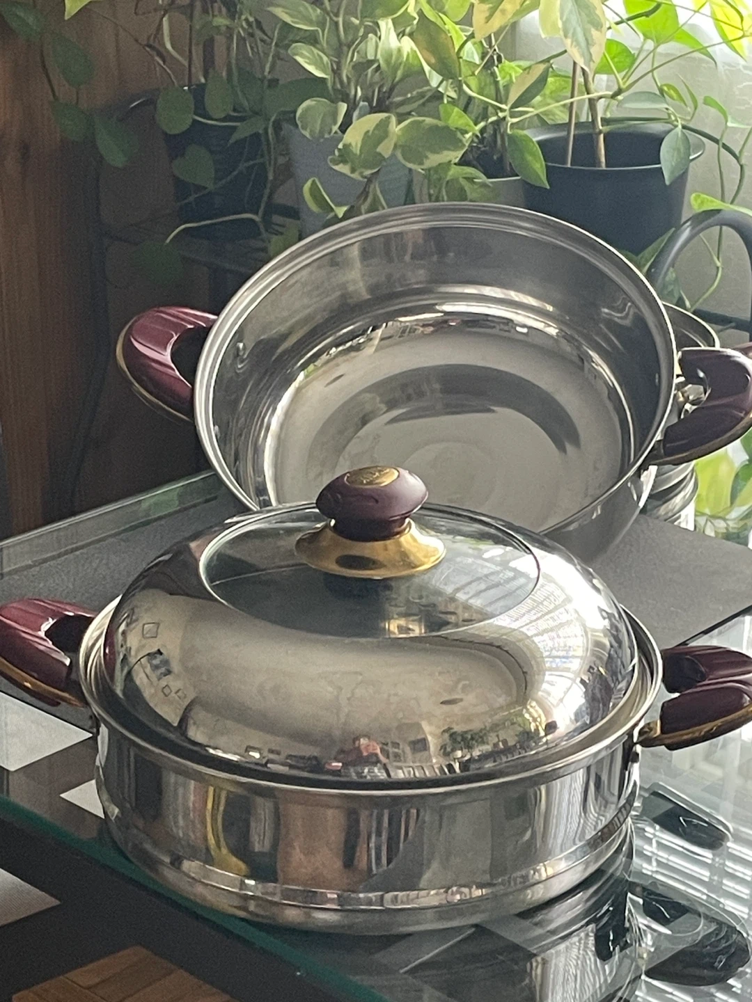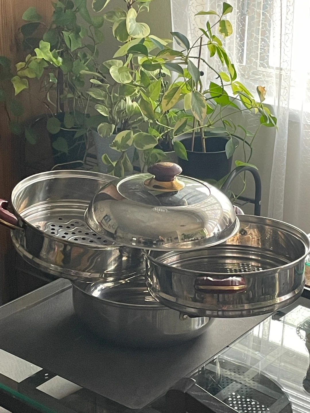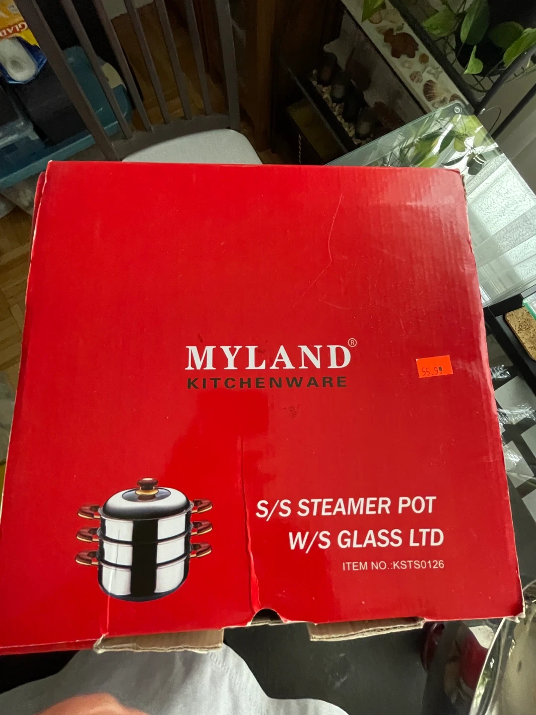 Selling a 3-tier Myland stainless steel steamer pot with a glass lid. Steam inserts are removable for versatile cooking options, quick clean-up, and compact storage. It comes in its original box, ready for a new home.