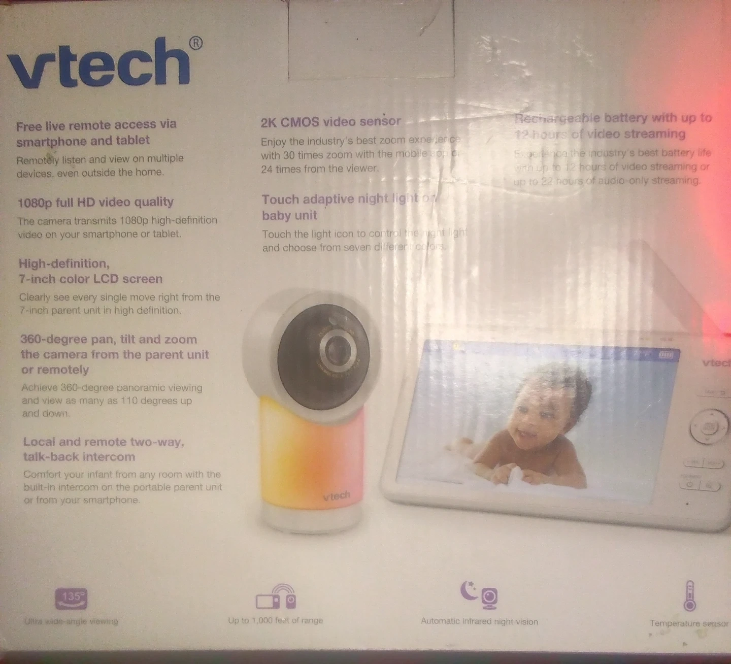VTech Pan & Tilt Smart High-Definition Video Monitor. It features a 7-inch color LCD screen for clear viewing. Includes 2K CMOS video sensor and rechargeable battery with up to 12 hours of video streaming. Local and remote two-way, talk-back intercom.