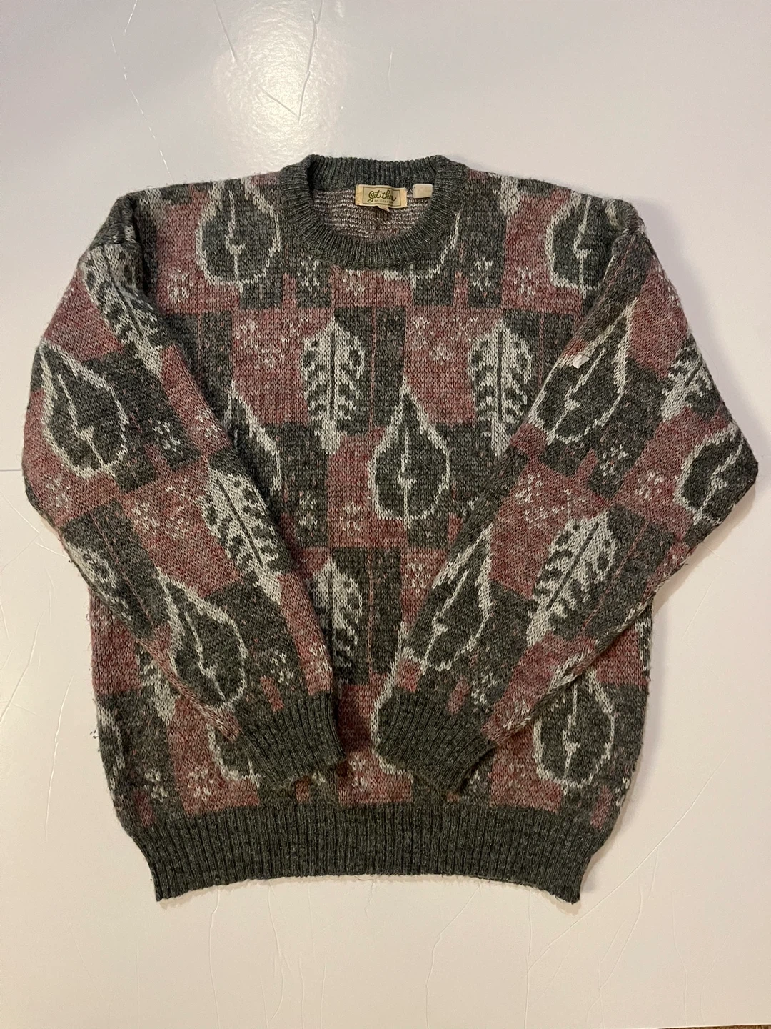 Get there by crocodile sweater with a cool leaf and geometric pattern. It's a size medium and features a crew neck. This cozy knit is great for cooler weather!