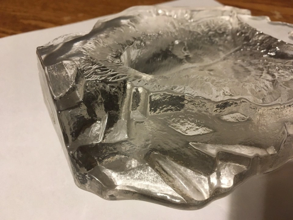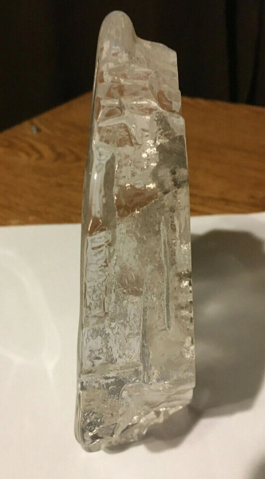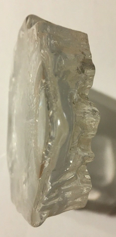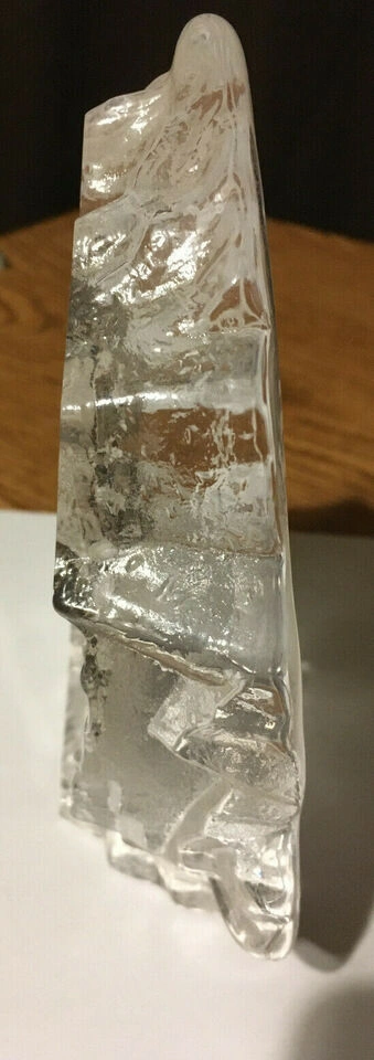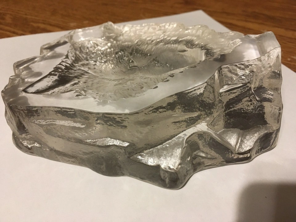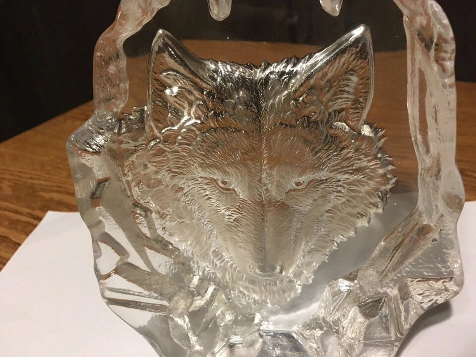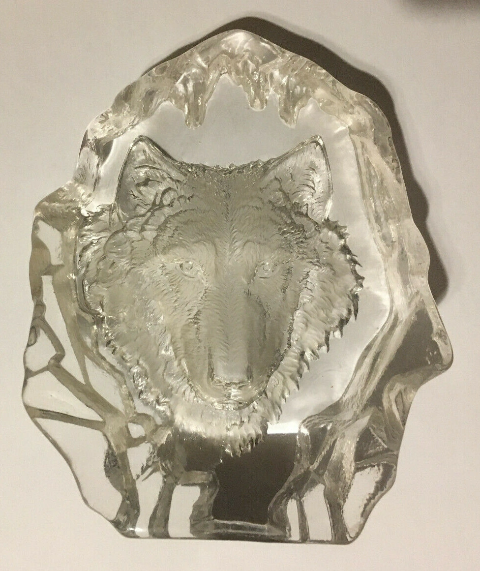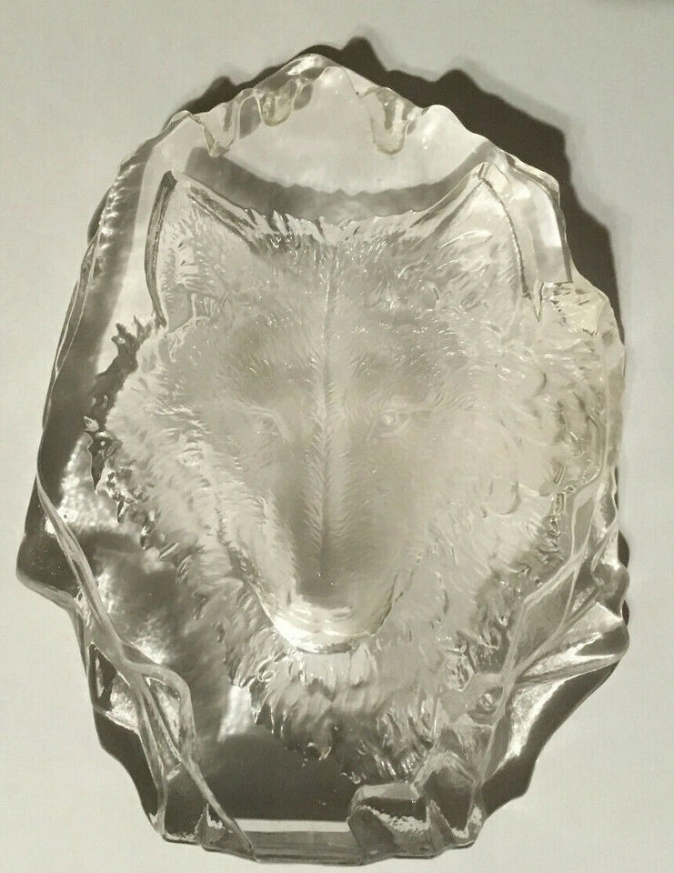 Unique glass paperweight. Features a wolf's head. Clear glass. Irregular shape. Collectible item. it's about 6x5 in weighing a little over 2 lb looks very nice if you put some kind of colored light behind it. Cash only pick up at house