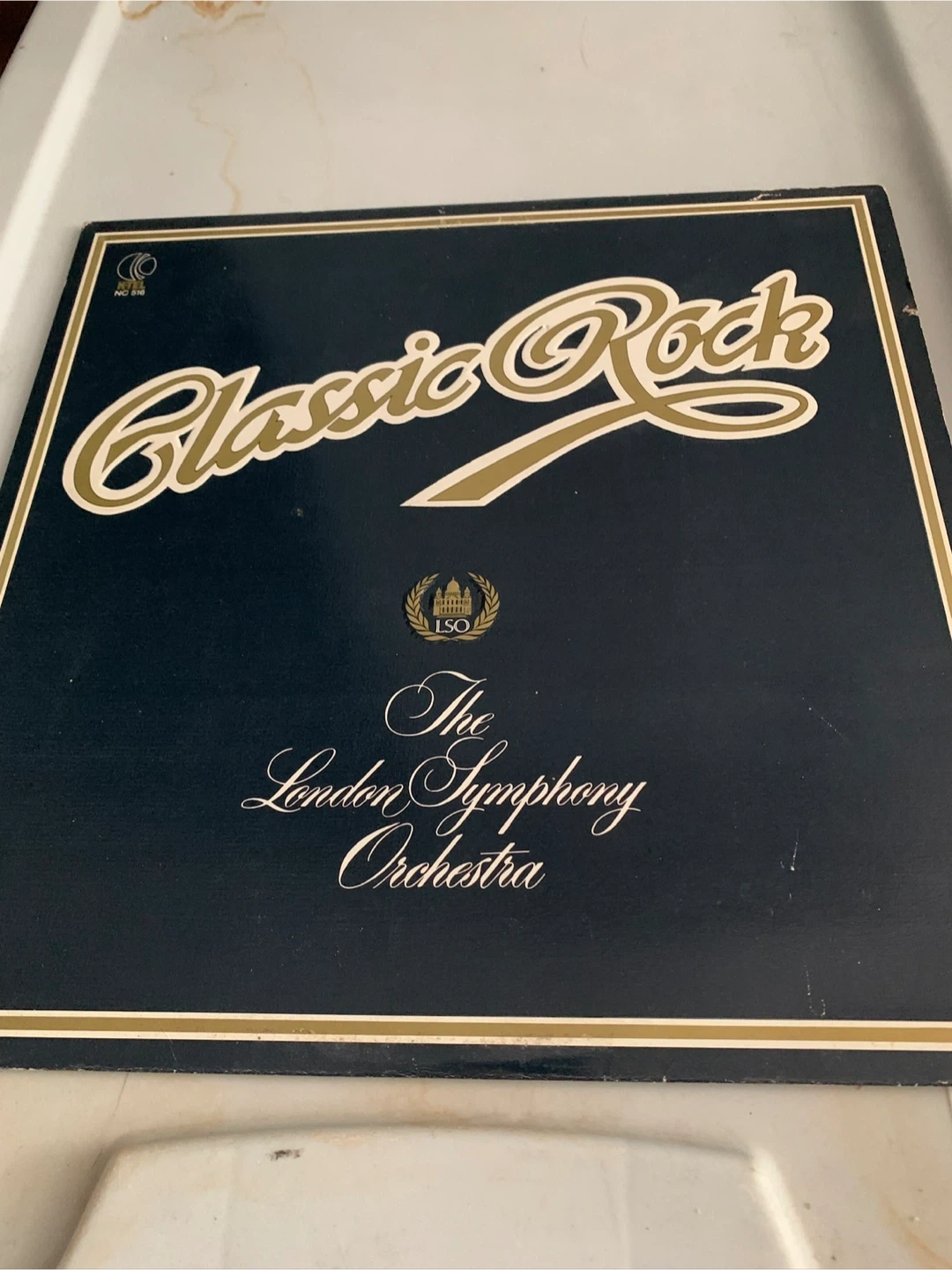 This is a vinyl record featuring Classic Rock songs performed by The London Symphony Orchestra. The record is housed in a dark blue sleeve with gold lettering. It's a great addition for any classic rock enthusiast.