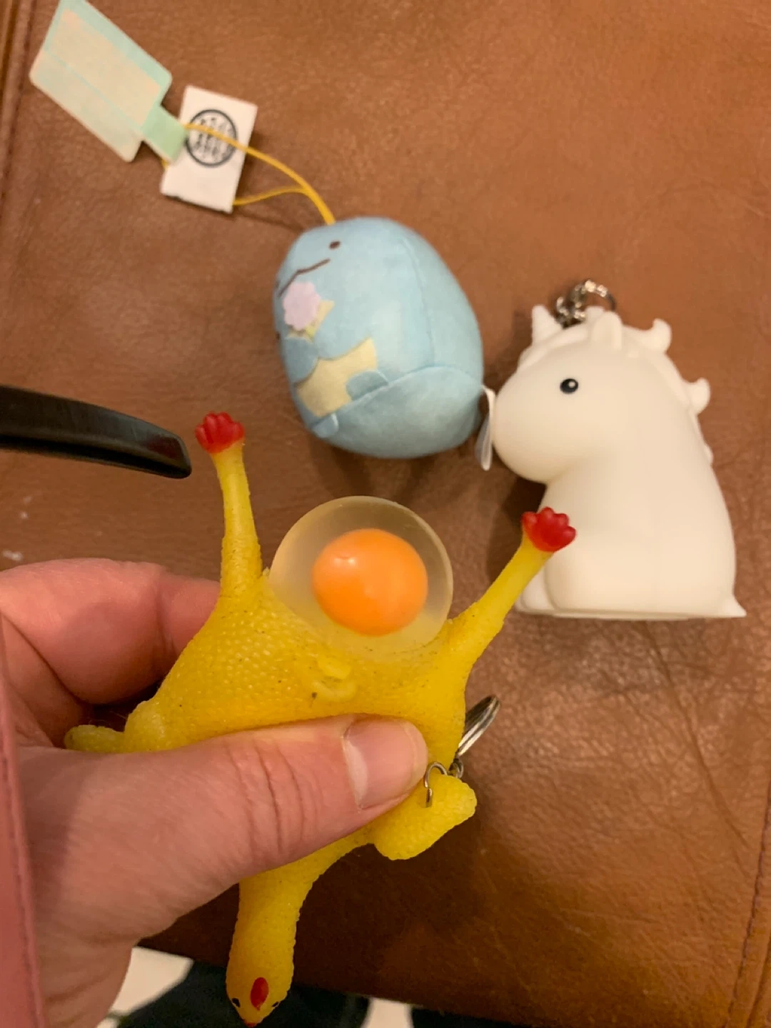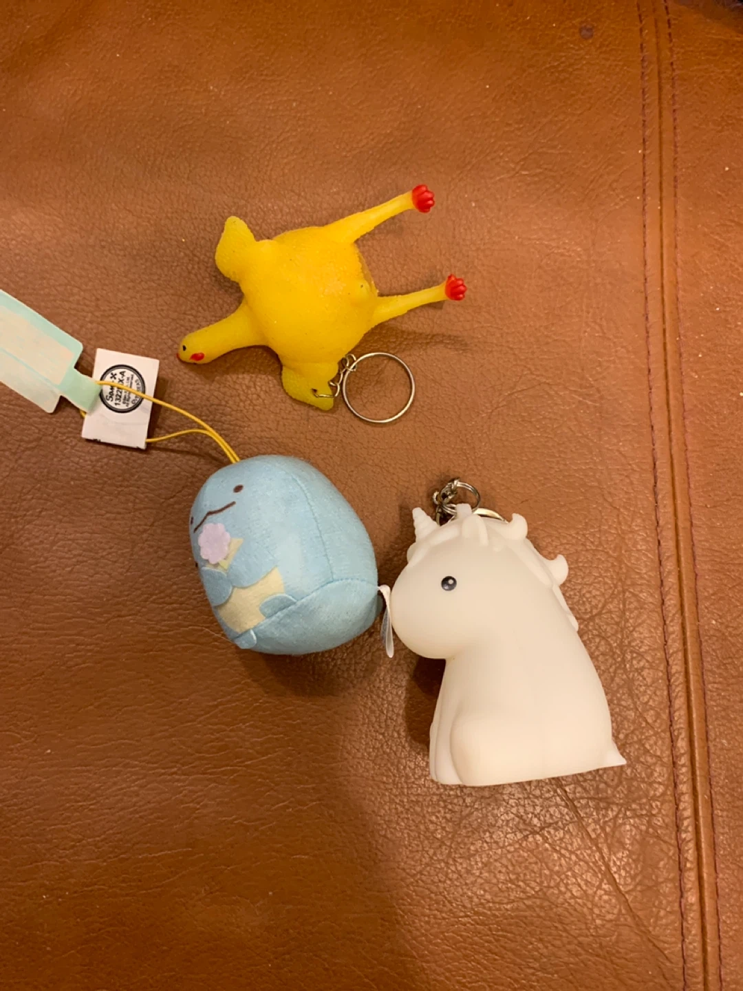 Fun yellow squeeze chicken toy with a mini plush character and a white unicorn keychain. Great for stress relief or as a cute accessory!