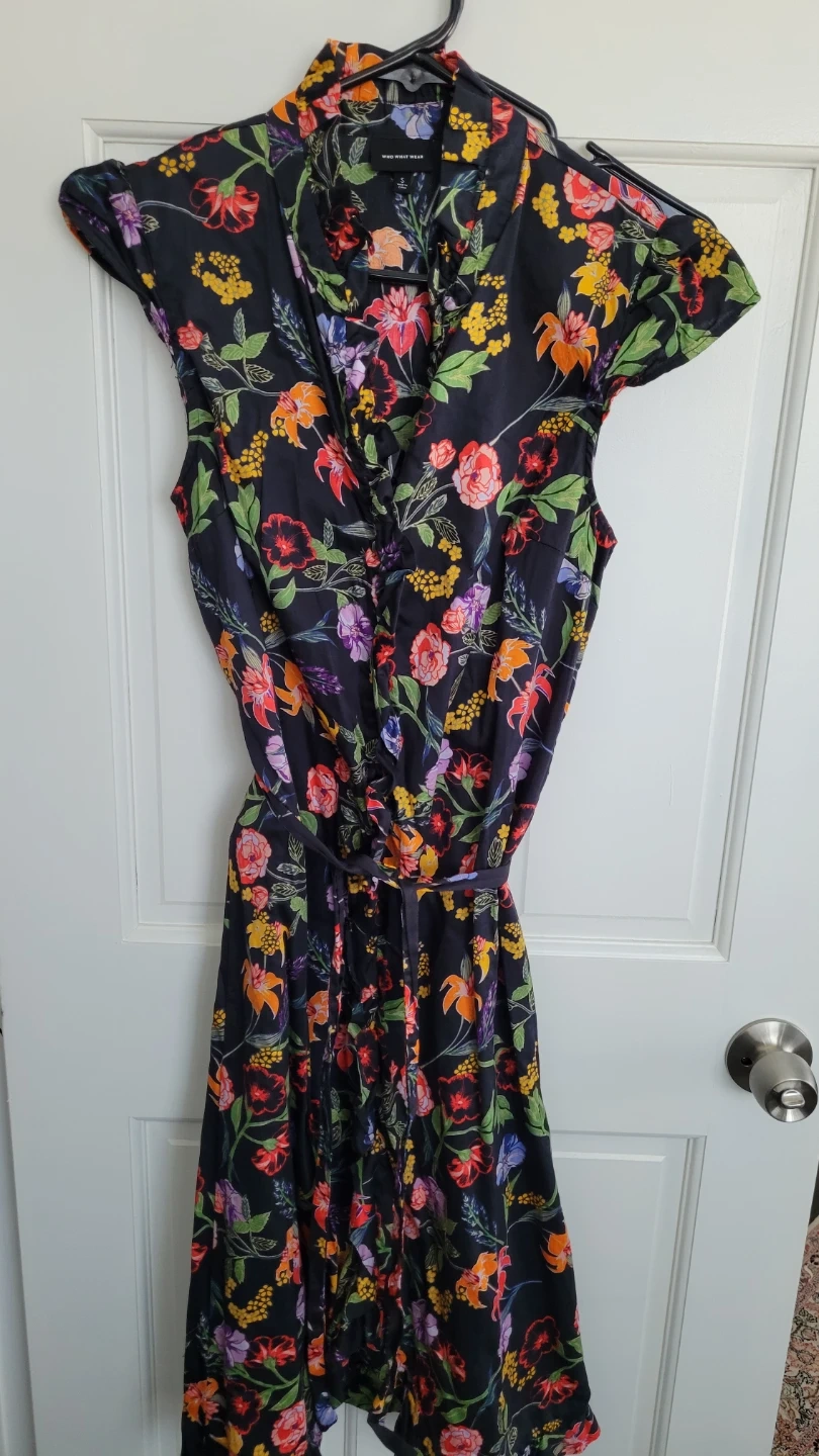This is a Who What Wear floral print dress. It features a black base with a vibrant all-over floral pattern. The dress has short sleeves and a tie waist. Size is small.