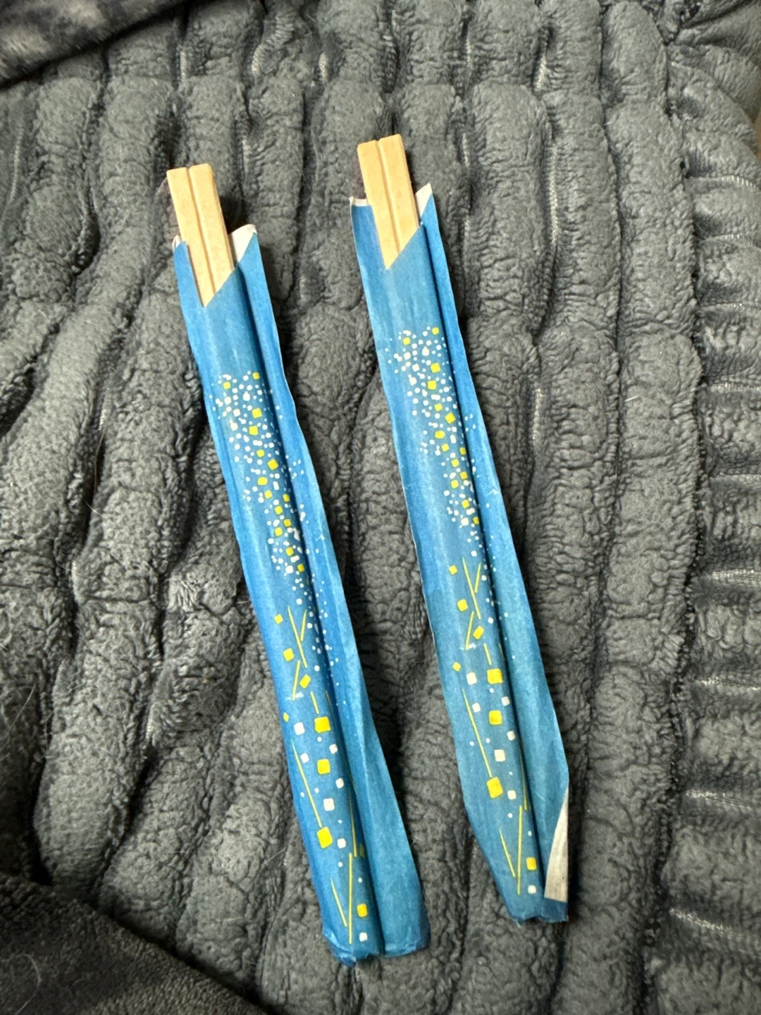 33Here's a pair of chopsticks, each in its own decorative blue paper sleeve! The sleeves have a fun design with white and yellow dots and squares. They're perfect for your next takeout meal or sushi night