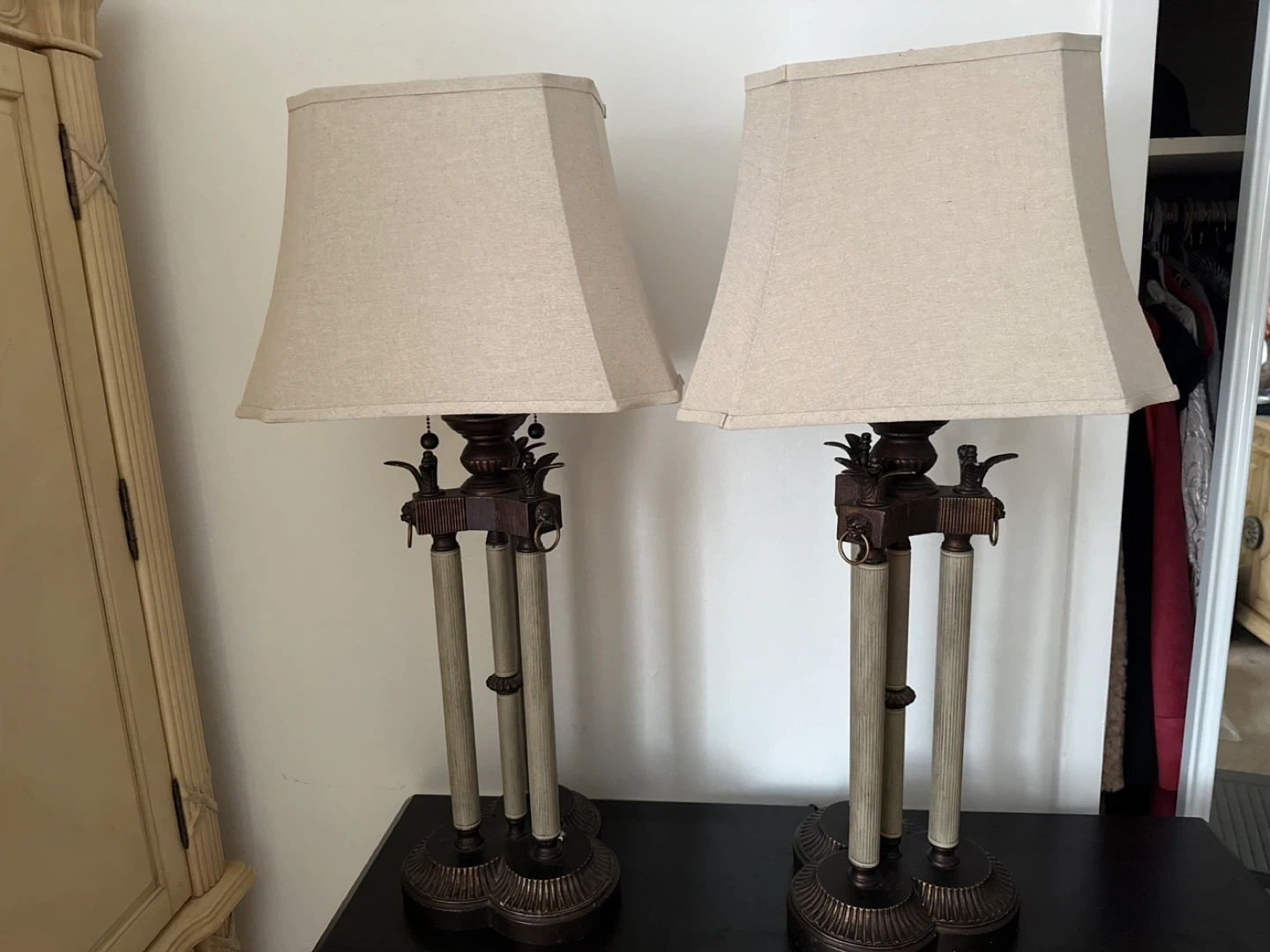 Selling a pair of decorative lamps. They have a unique design with a beige shade and a detailed base. They'd be perfect for adding a touch of elegance to any room