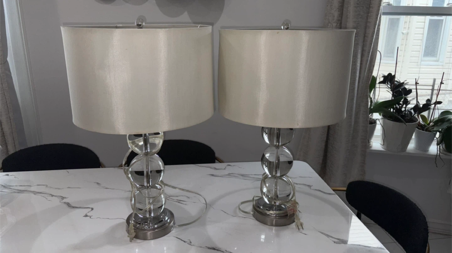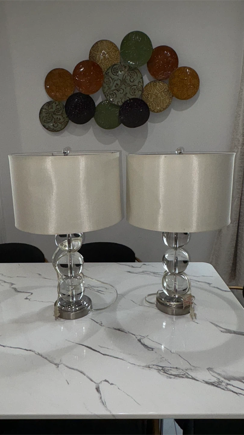 Selling a pair of table lamps! They feature a stylish glass ball design and neutral-colored shades. These lamps would look great in any living room, bedroom, or office space