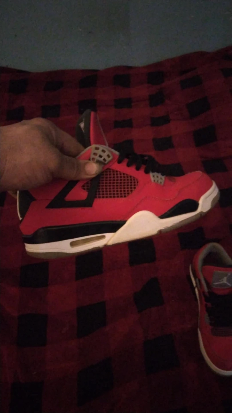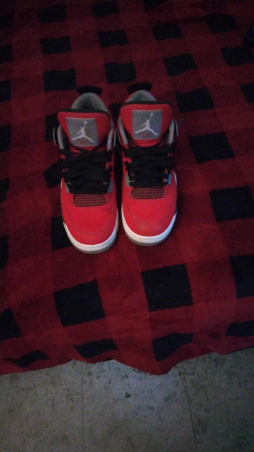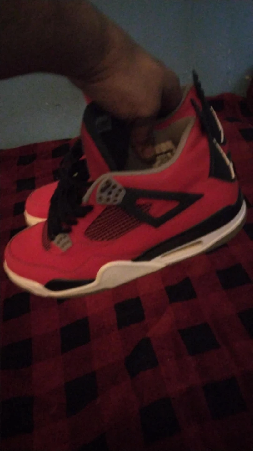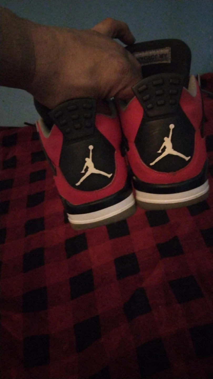 These are Air Jordan 4 sneakers in red, black, and white. They feature the Jumpman logo on the tongue and heel. Lace-up closure for a secure fit.