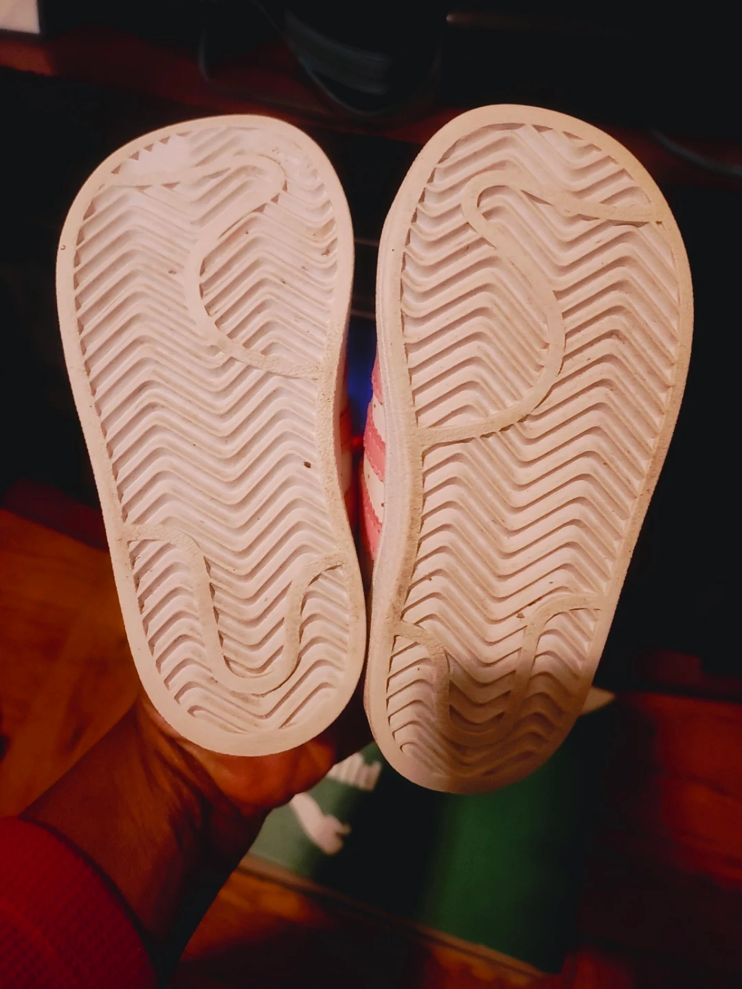 Toddler Adidas Superstar sneakers. White with pink stripes. Lace closure. Shell toe design.
