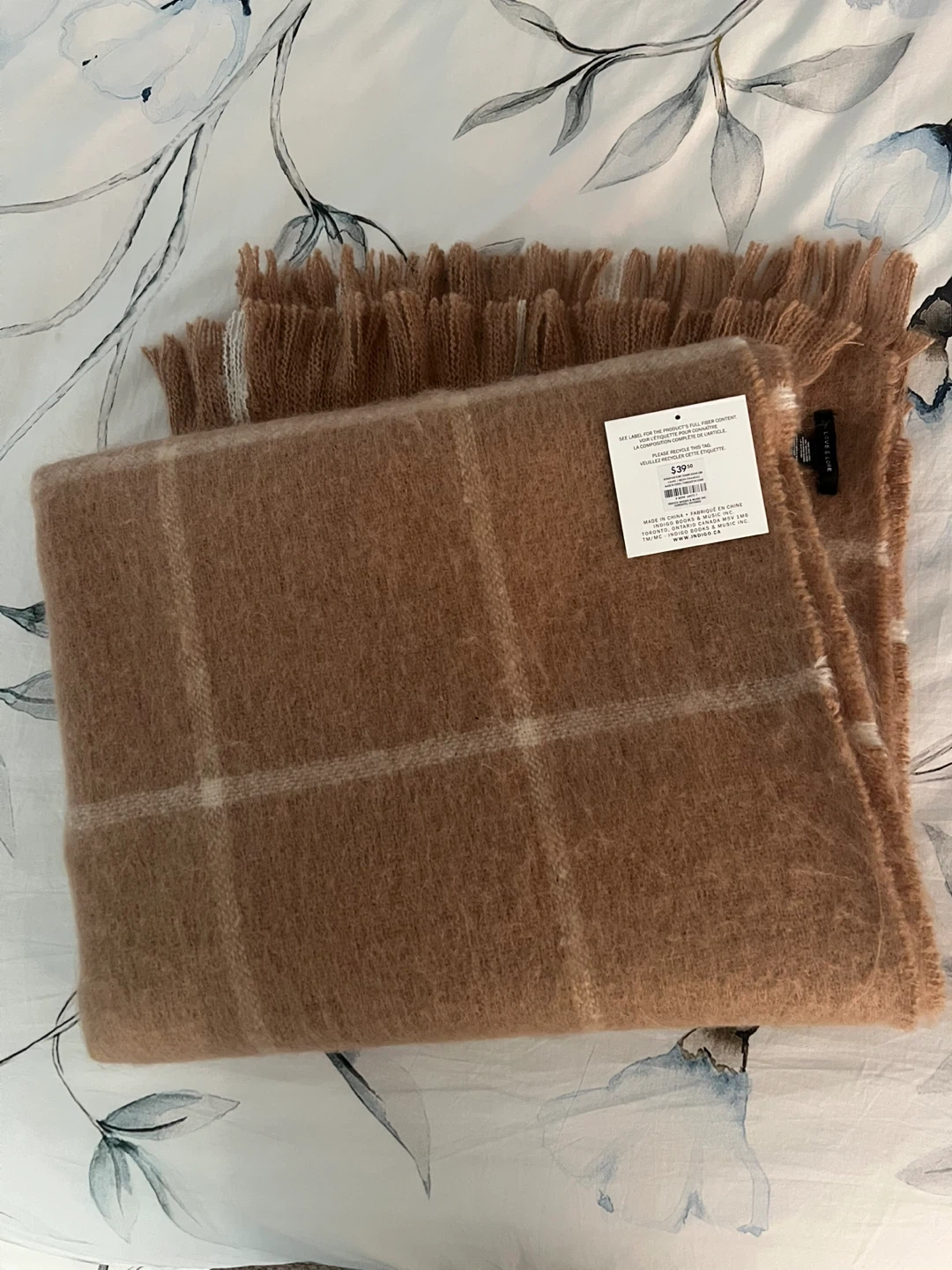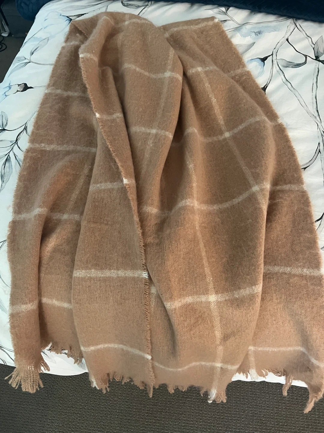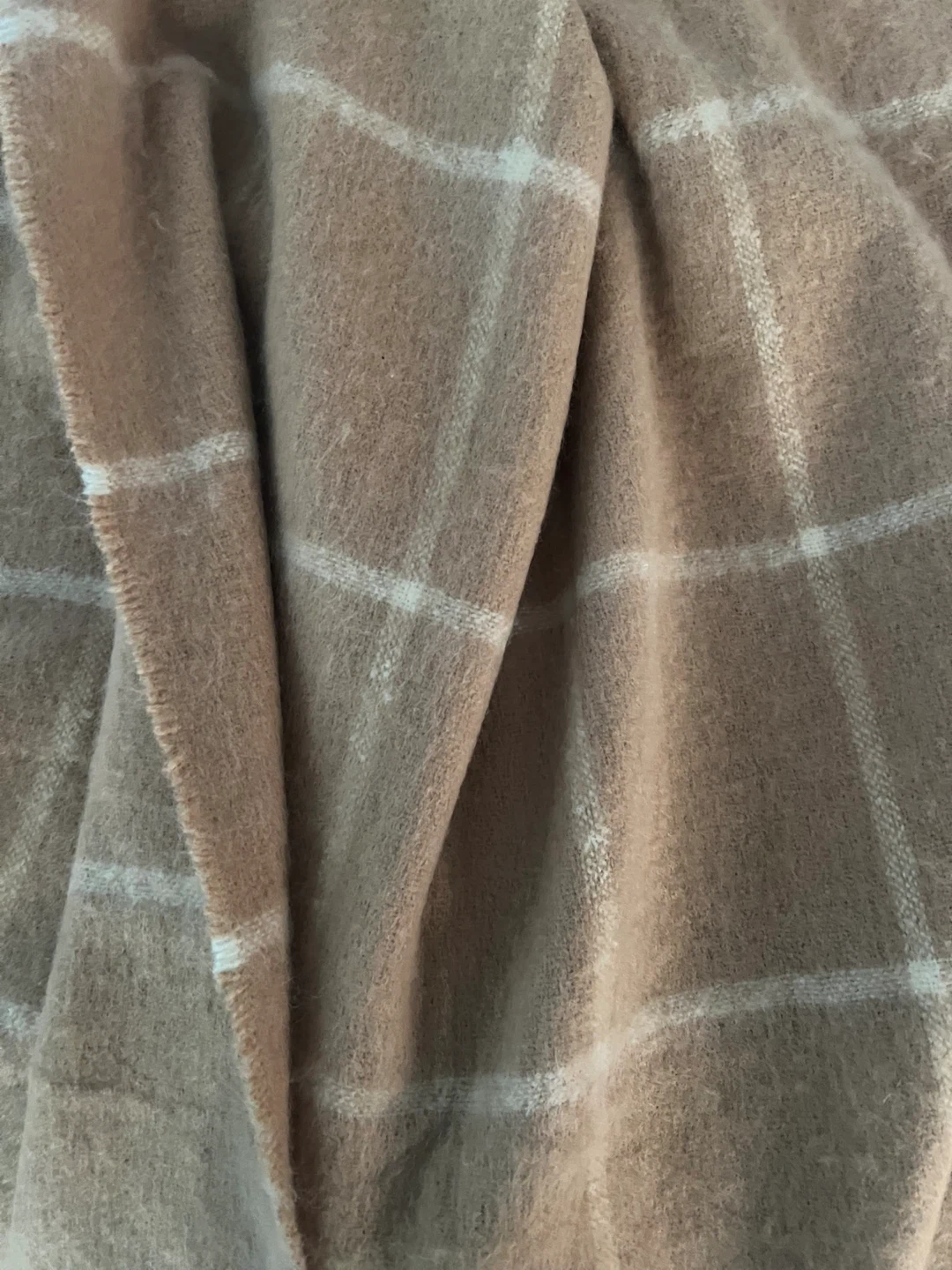 This soft, cozy blanket scarf features a classic plaid pattern in tan and white. It's made from a fuzzy material and has fringed edges. Perfect for staying warm during cooler weather! Never worn