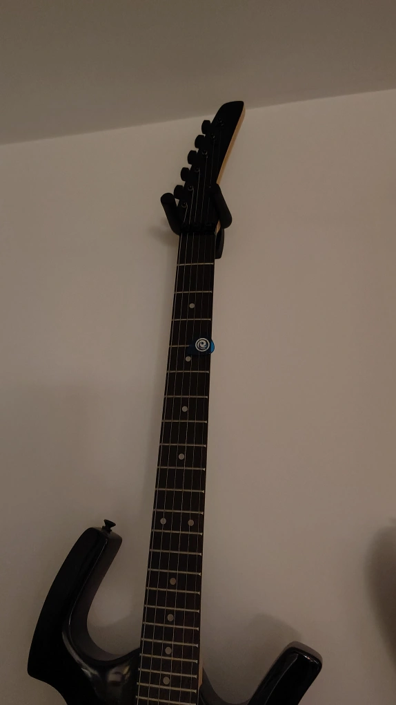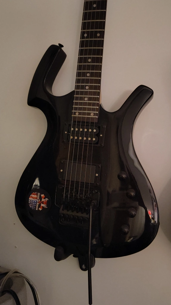 Black electric guitar. Features include a tremolo bridge and 24 frets. Mint condition. No case. decal can be removed with no issue by me