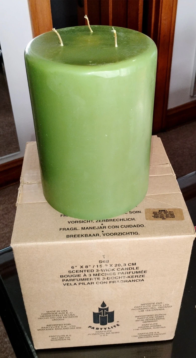 10Selling a Partylite scented 3-wick candle. It is 6" x 8" / 15.2 x 20.3 cm. The candle is green apple/vert feuille/manzana verde/apfel grum/vihrea omena/lightivihrea