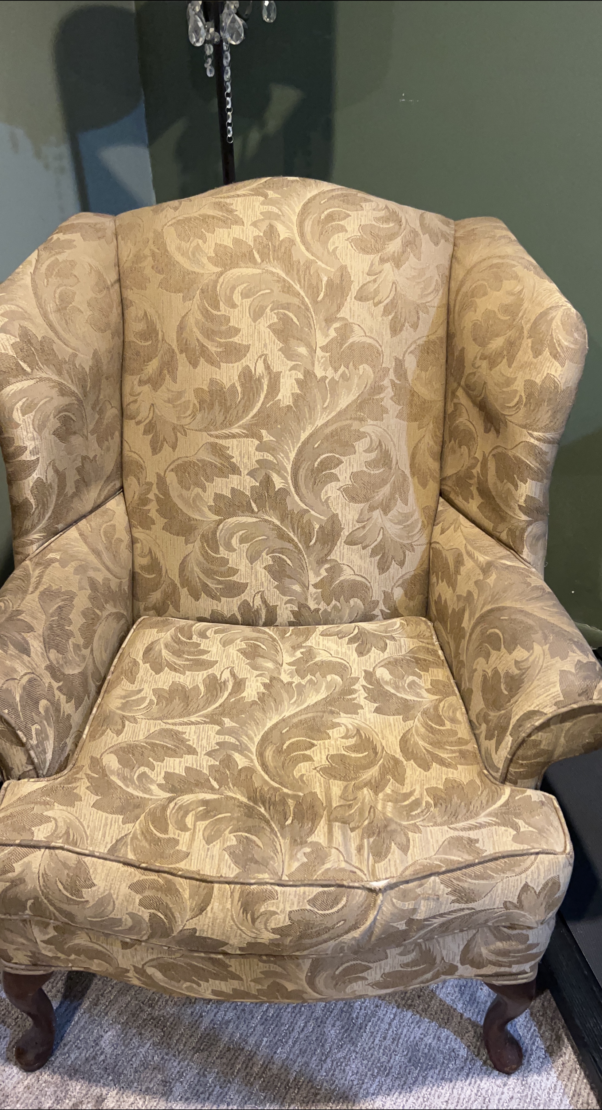 Selling a comfortable wingback armchair with a patterned design. It's in good condition and would be a great addition to any living room or reading nook. The chair features a classic wingback design and a neutral color palette that can easily complement various decor styles