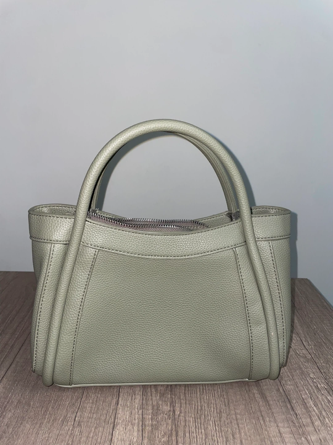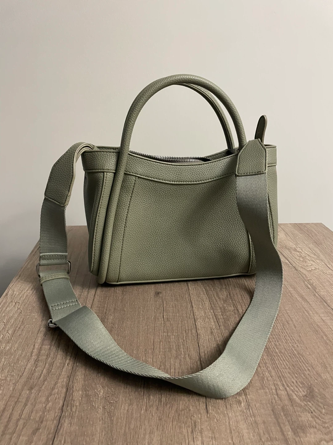 A stylish light green handbag with a pebbled texture. It features double top handles and an adjustable, detachable shoulder strap for versatility. Zipper closure keeps your belongings secure.