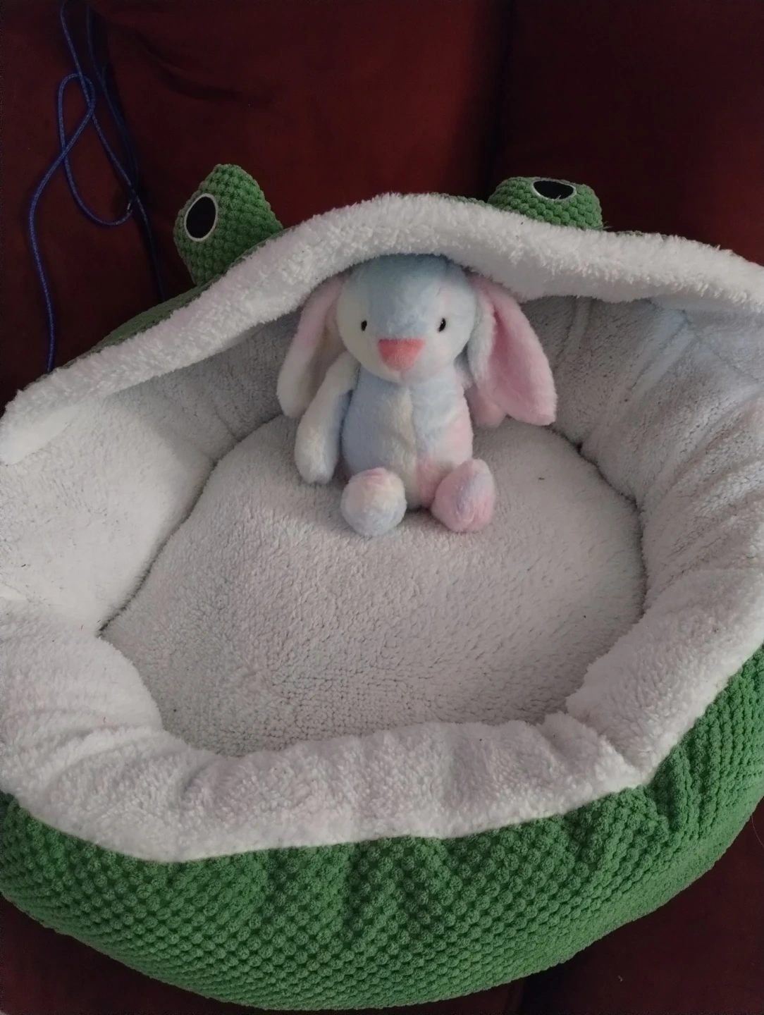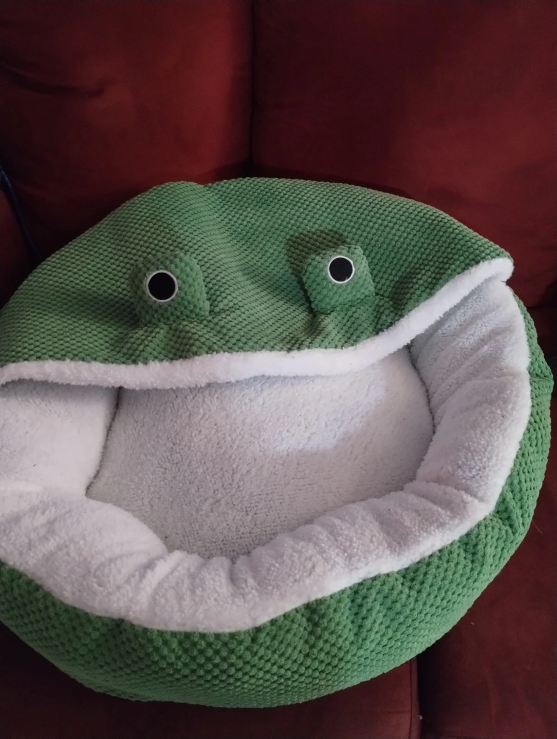 Cozy green pet bed designed like a frog's face. It features a soft white sherpa lining for warmth and comfort. A fun hideaway for cats or small dogs!
