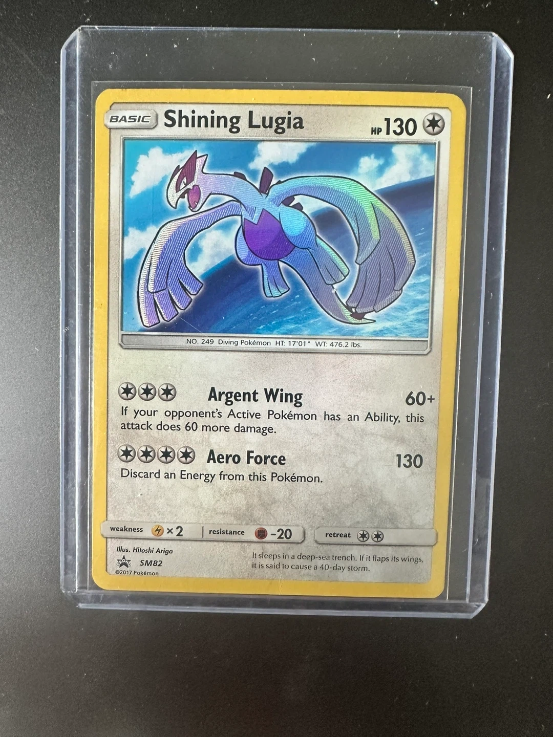 Basic Shining Lugia Pokémon card. HP 130. It has the Argent Wing attack that deals 60+ damage and Aero Force that deals 130 damage. This card is from 2017.