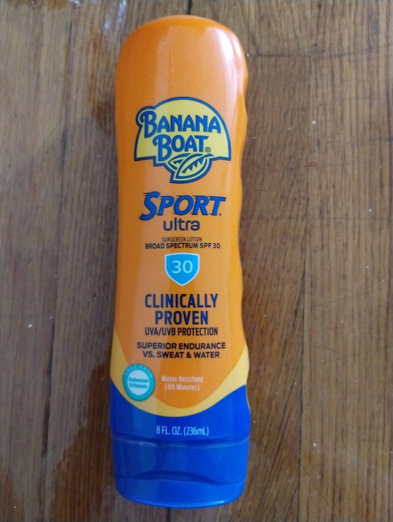 Selling a bottle of Banana Boat Sport Ultra sunscreen lotion with SPF 30! It's clinically proven for UVA/UVB protection and offers superior endurance against sweat and water. This sunscreen is water-resistant for up to 80 minutes and comes in an 8 fl oz (236mL) bottle