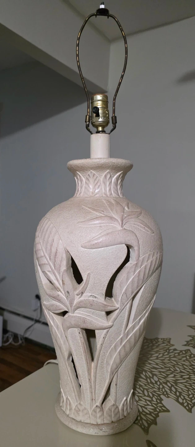 Decorative lamp base featuring a carved Bird of Paradise motif. It's made of a textured, off-white material. This piece brings a touch of tropical flair to any room. Measures approximately 15 inches tall.