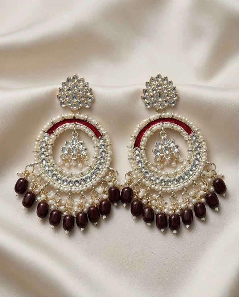 Gorgeous pair of earrings. Has a silver tone finish with clear stones and white pearls. Features a dark red accent and dark brown bead drops.
