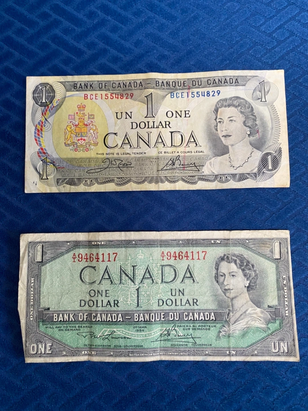 Two vintage one dollar bills from the Bank of Canada. Features Queen Elizabeth II on one and Coat of Arms on the other. Bills show signs of circulation.