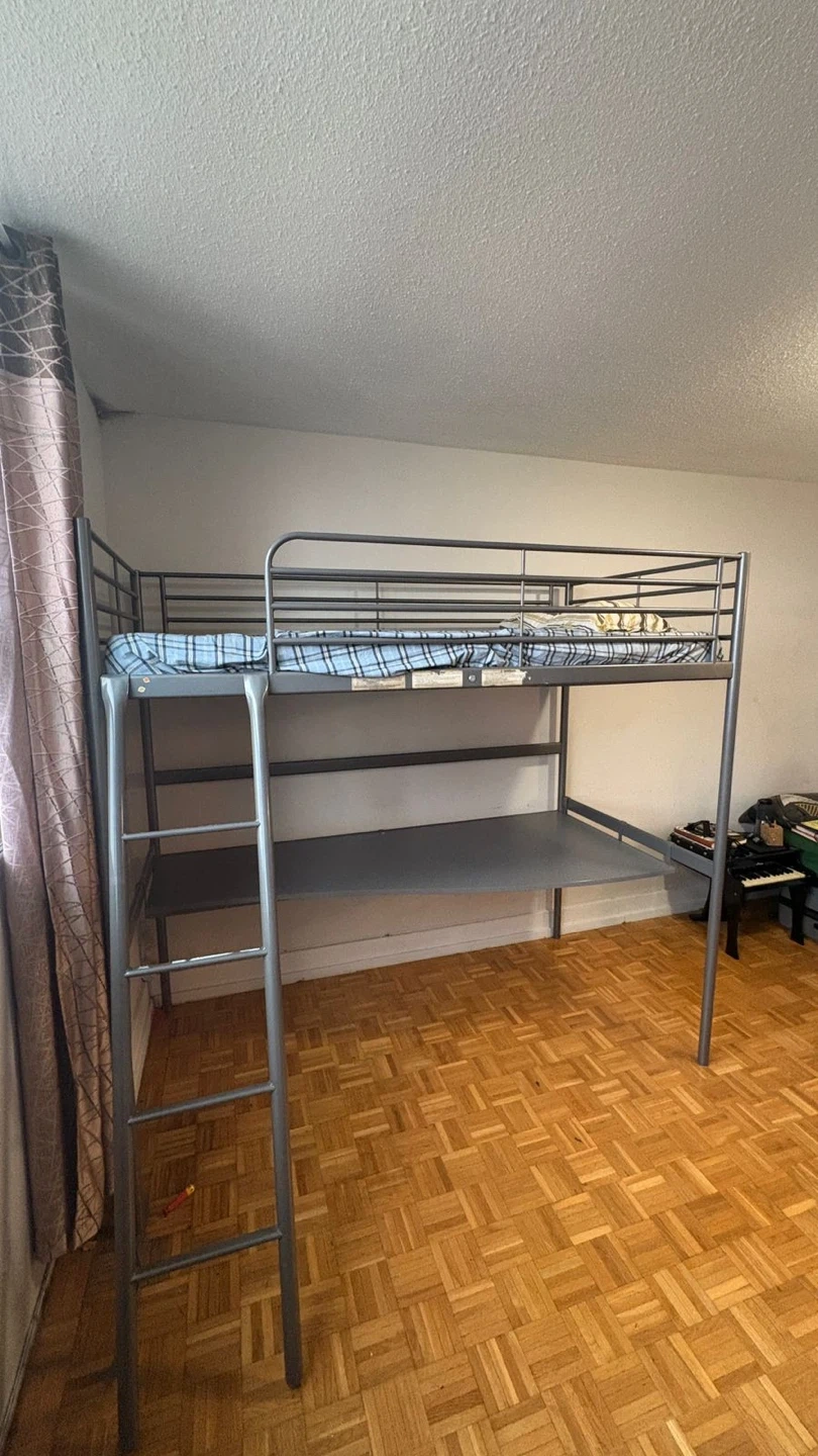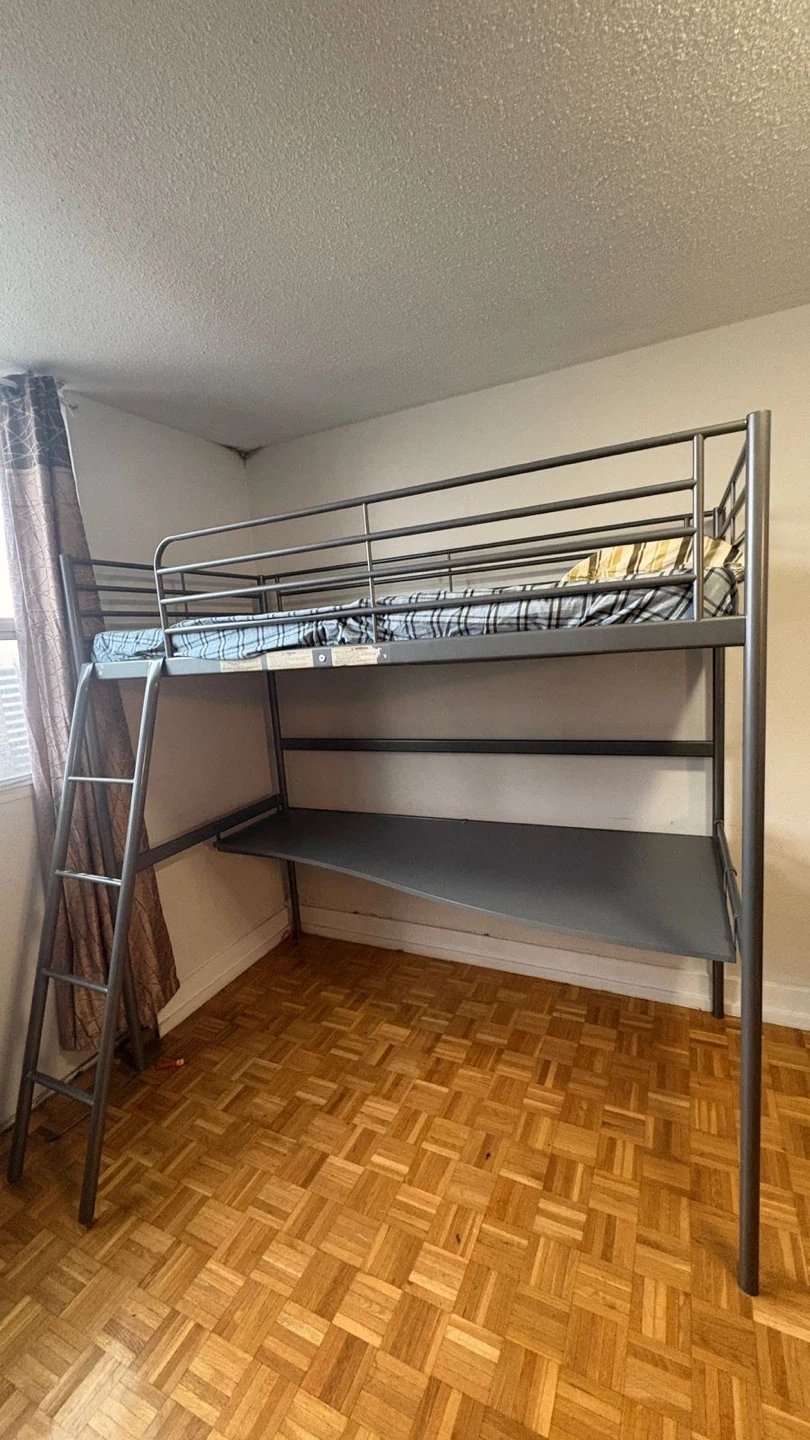 This is a metal loft bed frame. It includes a built-in desk surface underneath the bed. A ladder is attached for easy access to the top bunk. The frame is grey, without bed dismantled ready to pickup .