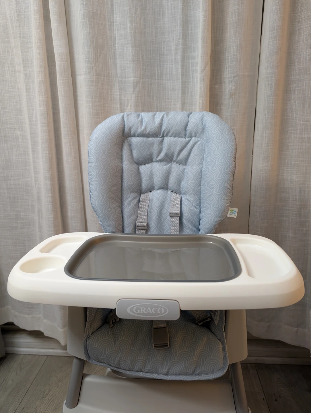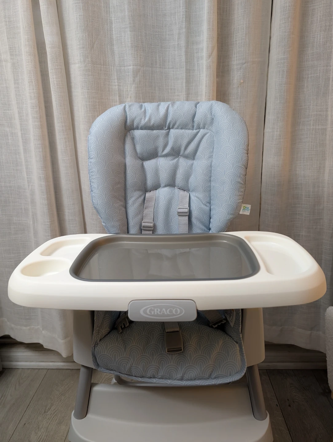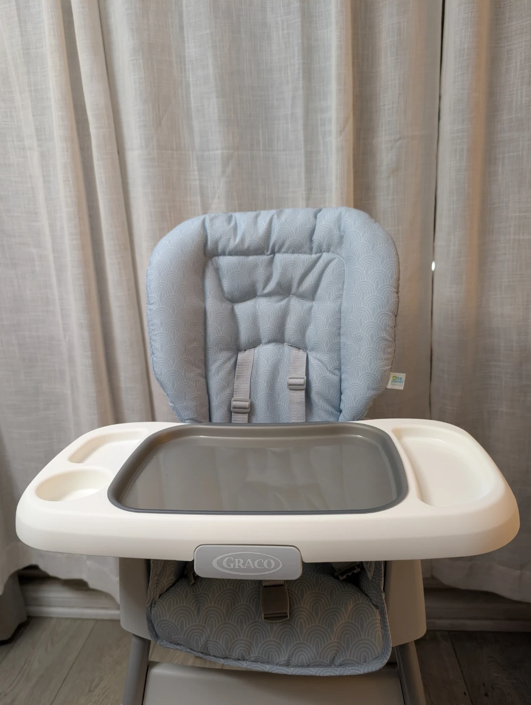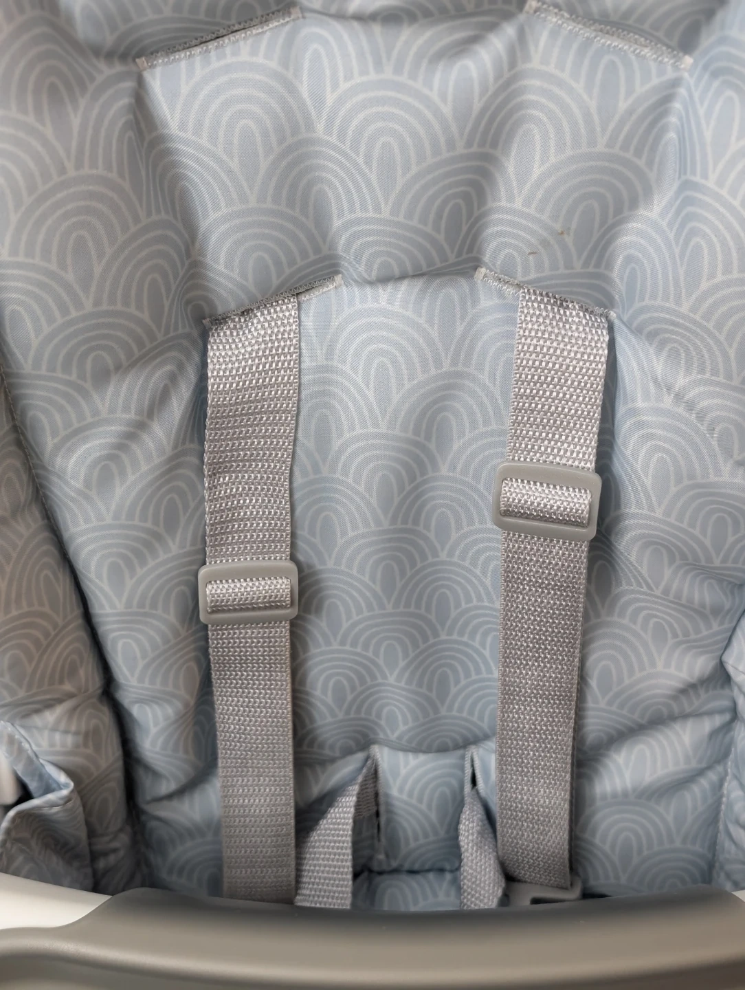 This Graco high chair comes with a blue padded seat featuring a rainbow arc pattern. It has a removable tray with cup holders. Straps are included for safety.