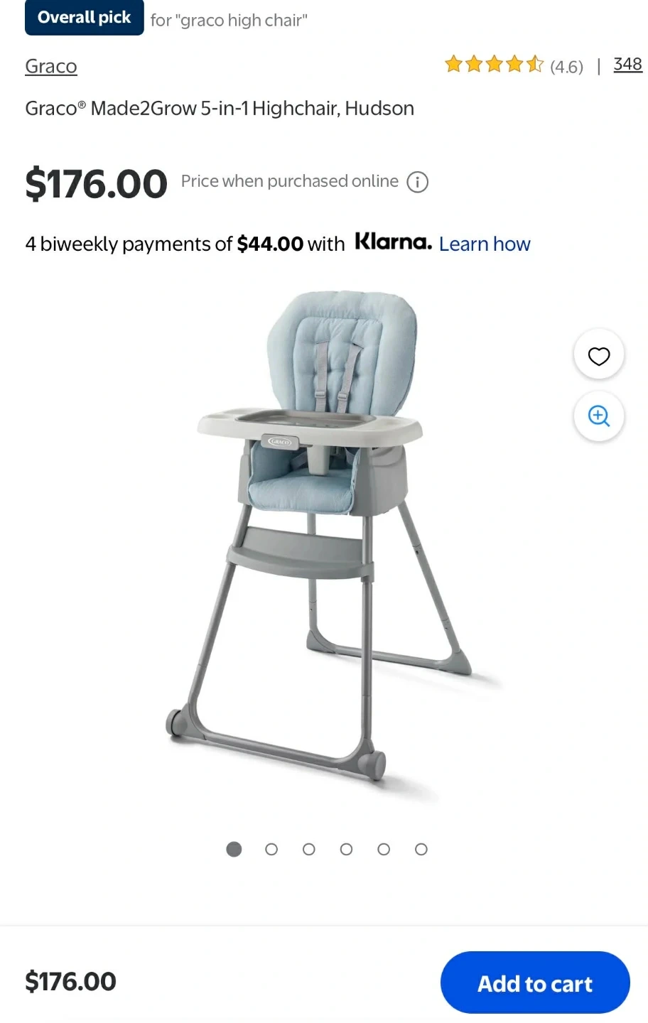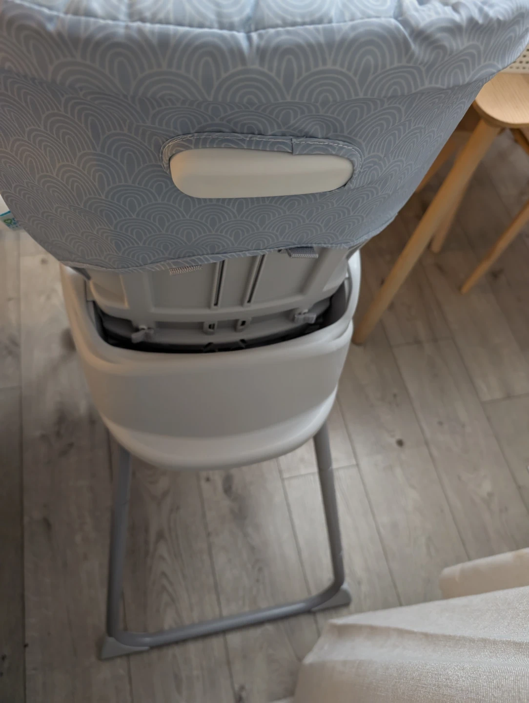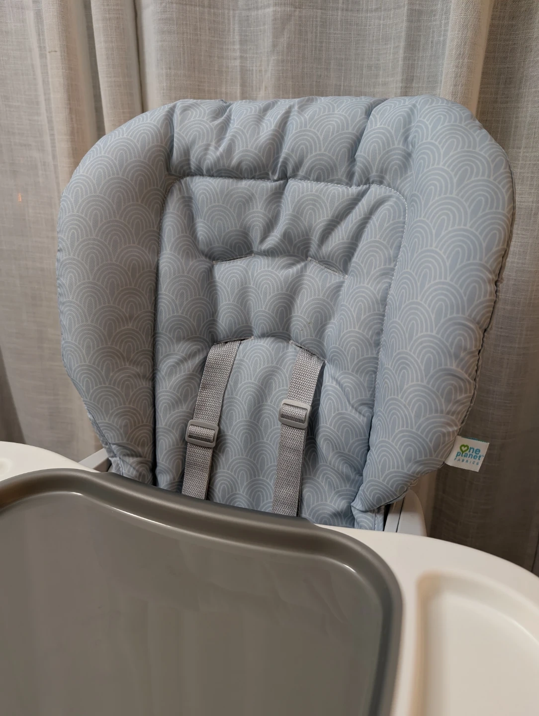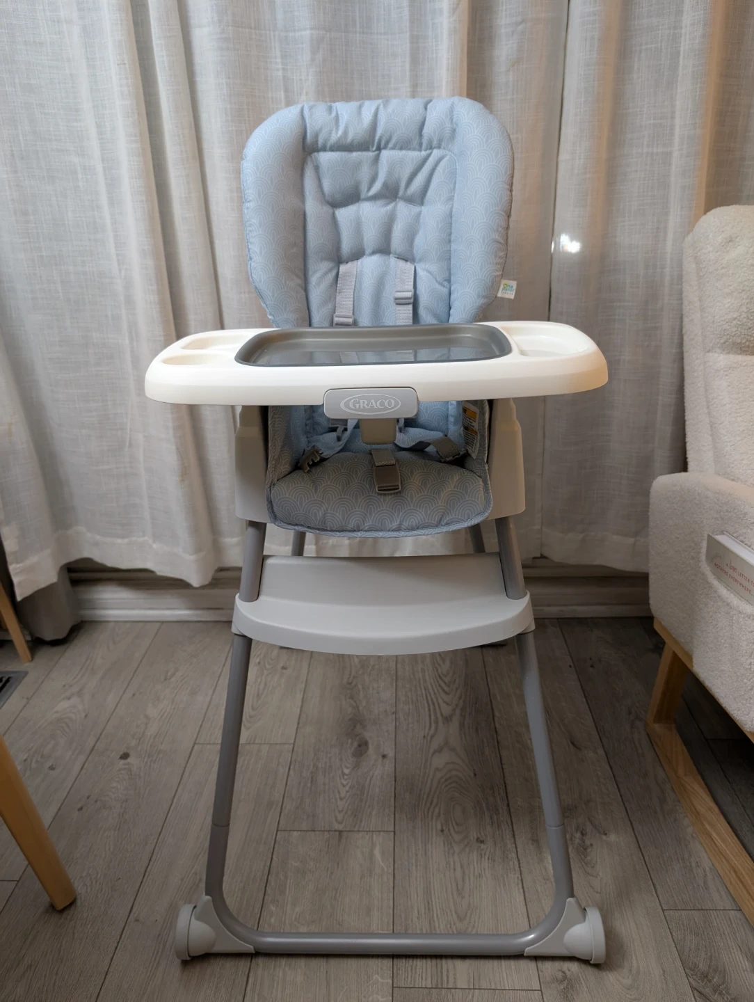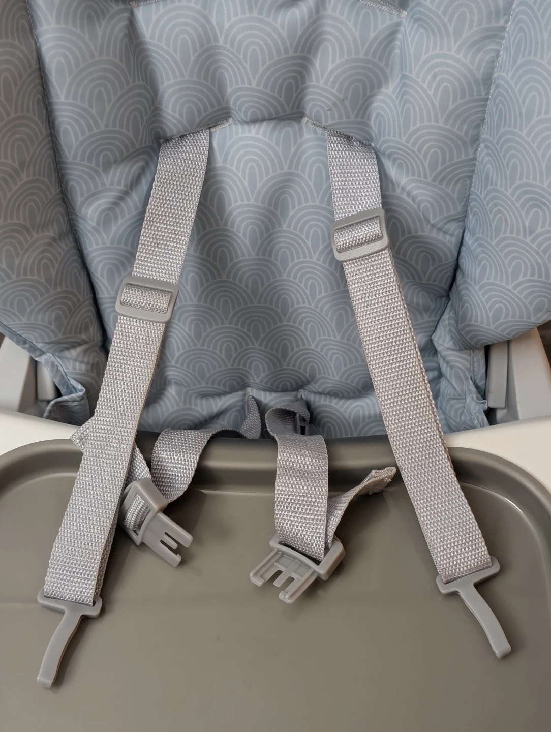 This Graco high chair comes with a blue padded seat featuring a rainbow arc pattern. It has a removable tray with cup holders. Straps are included for safety.