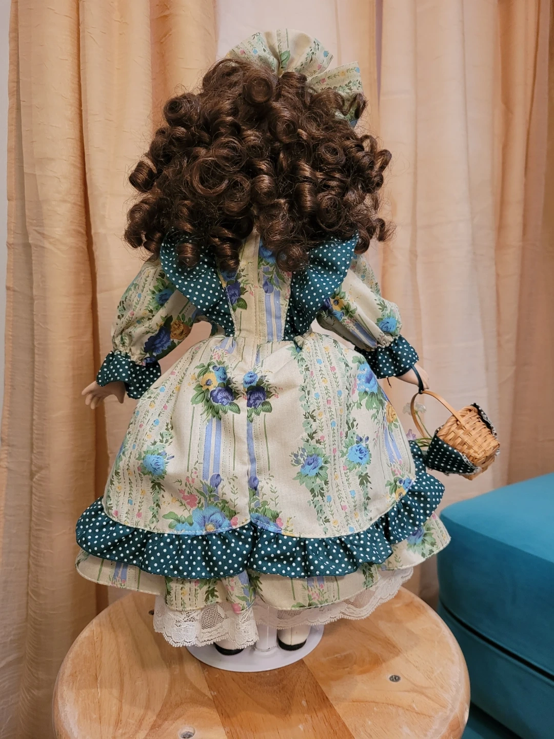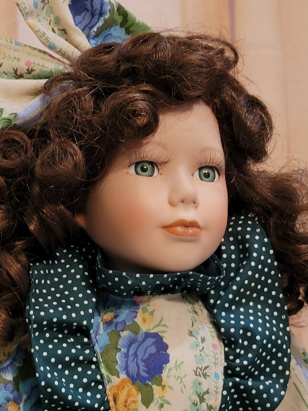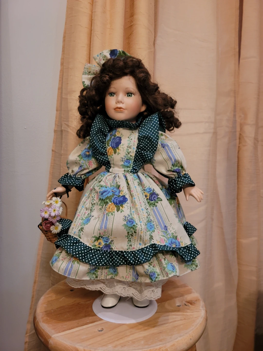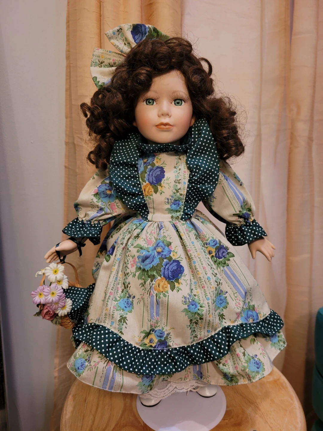This beautiful porcelain doll wears a detailed floral print dress with green polka dot accents. It features lace trim and she is holding a small wicker basket. Underneath are pantaloons and petticoat. Doll has curly brown hair and striking green eyes. Good condition. Two tiny spots on one back shoe see close-up photo.
