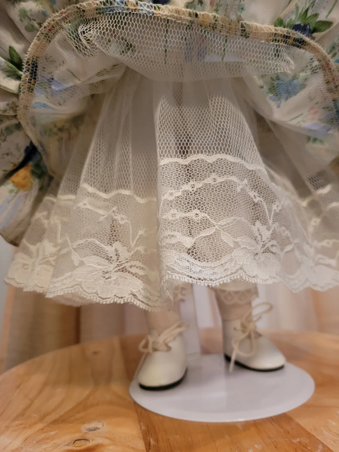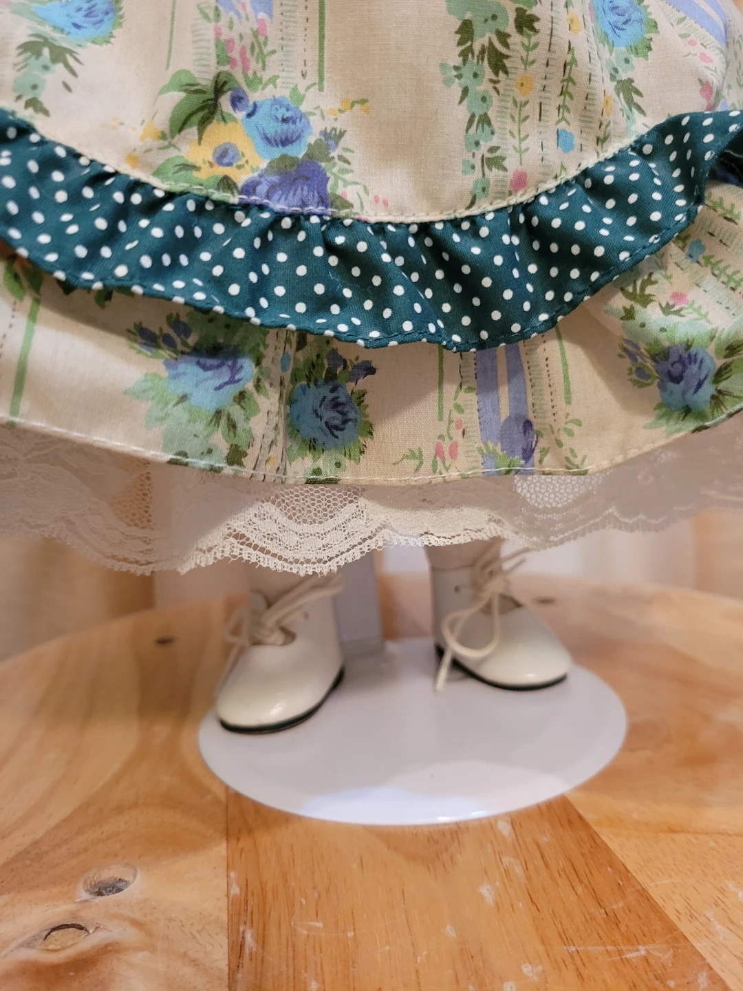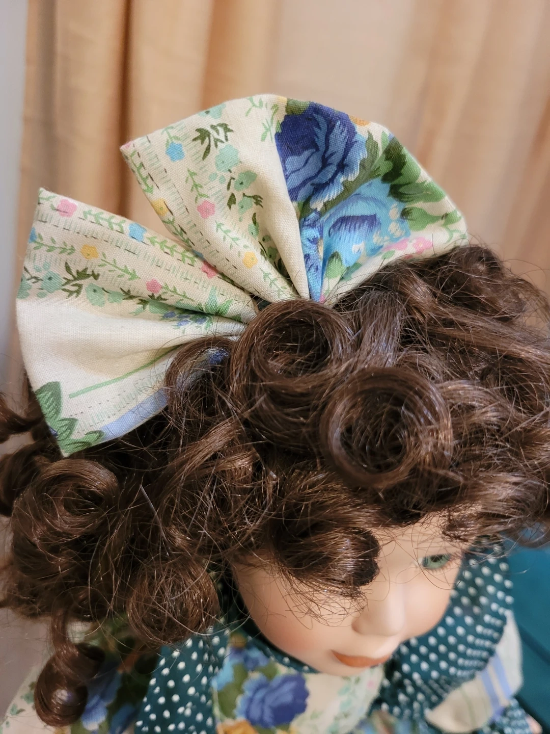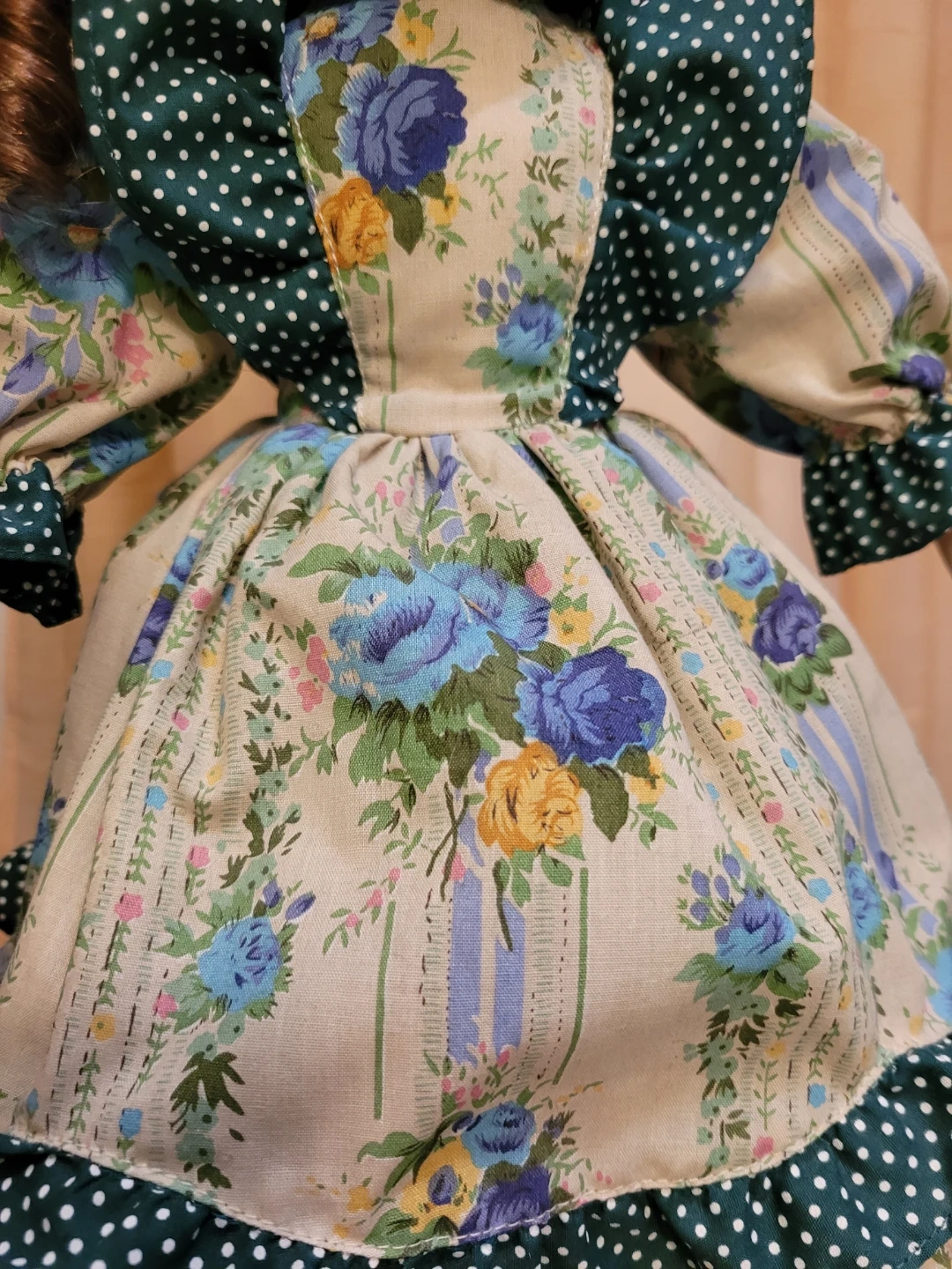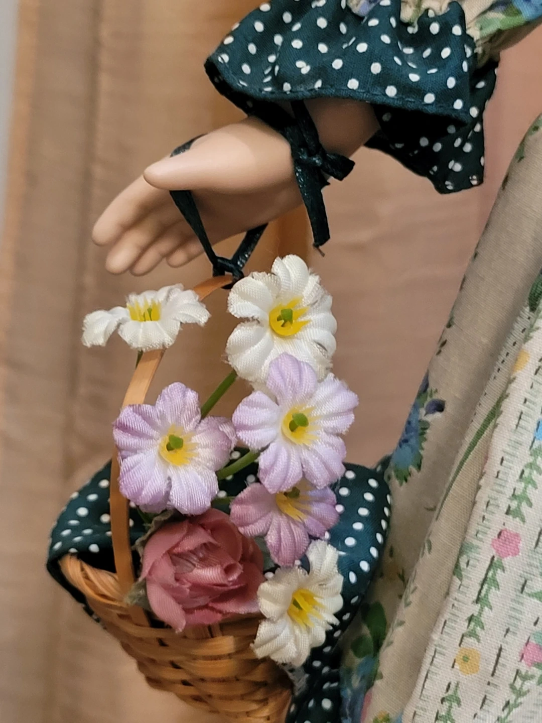 This beautiful porcelain doll wears a detailed floral print dress with green polka dot accents. It features lace trim and she is holding a small wicker basket. Underneath are pantaloons and petticoat. Doll has curly brown hair and striking green eyes. Good condition. Two tiny spots on one back shoe see close-up photo.