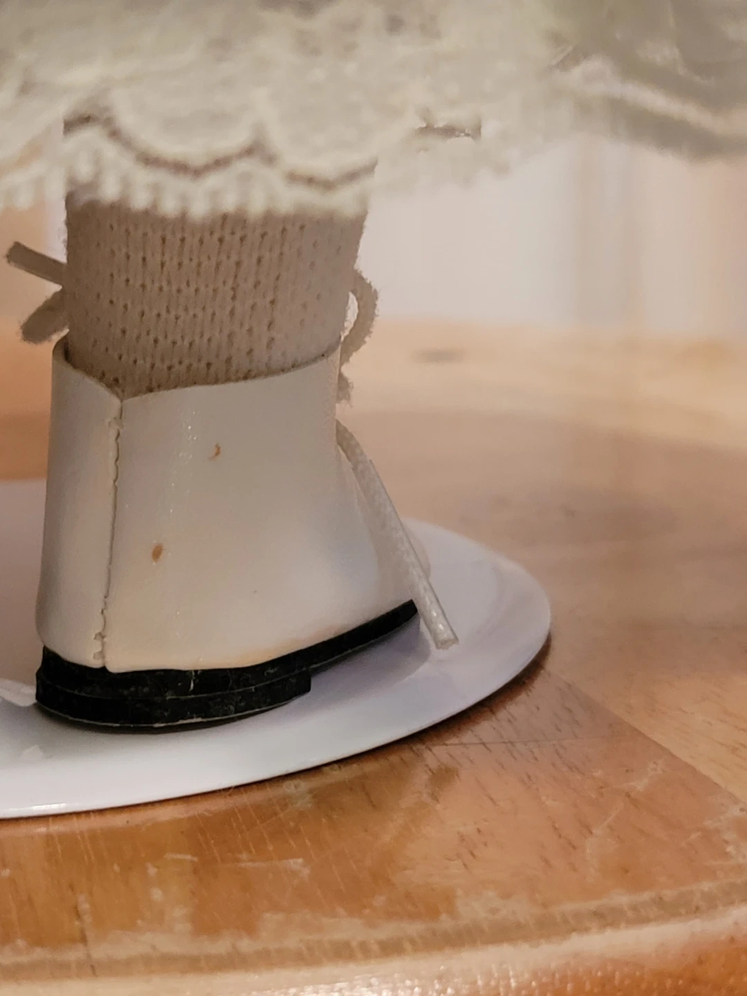 Handcrafted face, arms and legs of fine bisque porcelain. Hand-tailored fabric, trimmings and accessories. Approximately 16 inches high with display stand included.