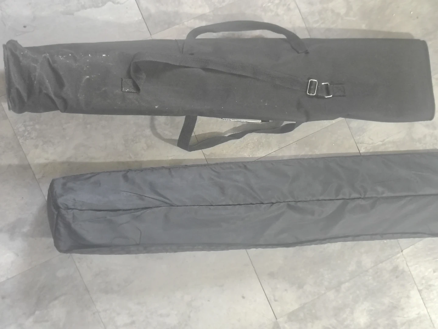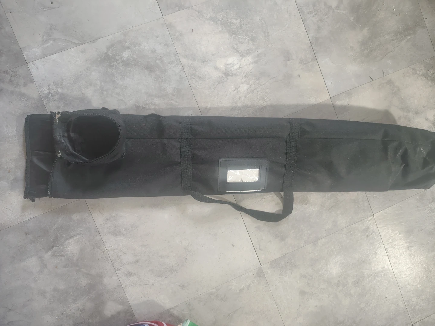 This is a black carrying bag designed for a display stand. It's made of durable fabric and features a shoulder strap for easy transport. The bag is long and cylindrical, suitable for holding rolled-up banner stands or similar items., pool cues.