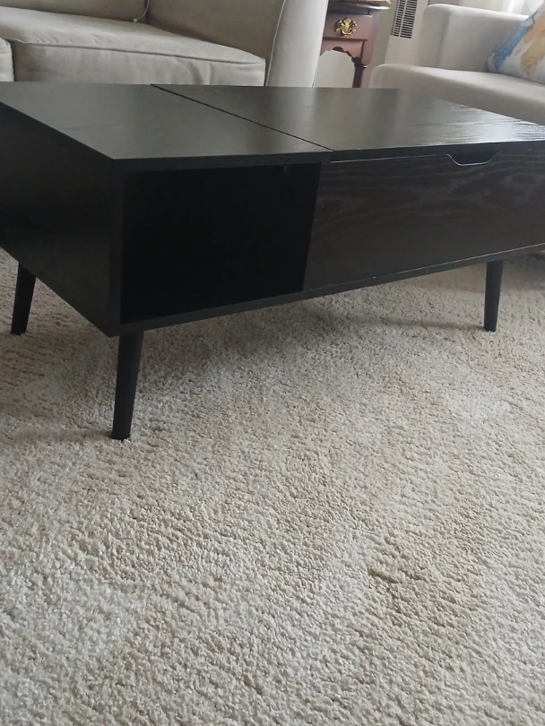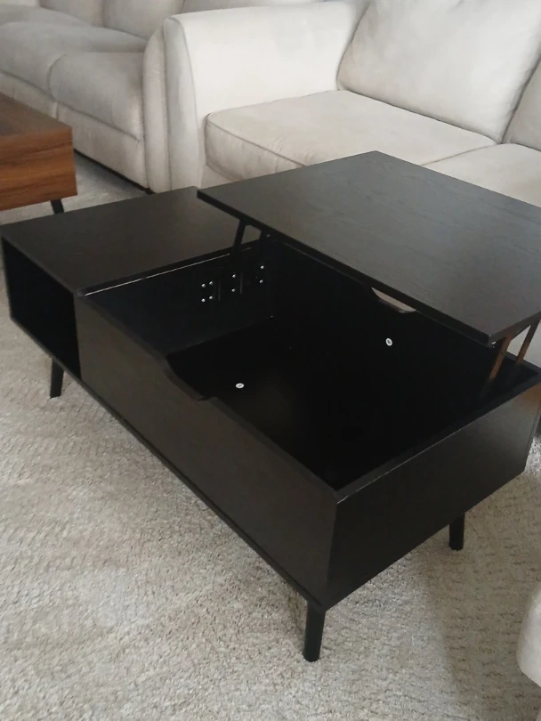 This black coffee table features a lift-top design for easy access to storage. It has a modern look with tapered legs and a convenient open shelf. The lift-top mechanism is sturdy and simple to use.