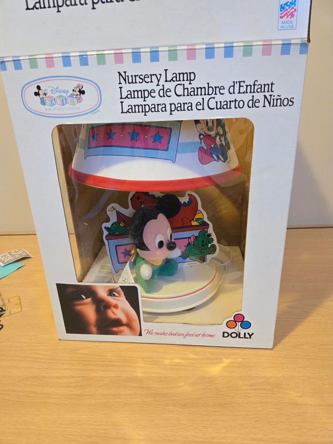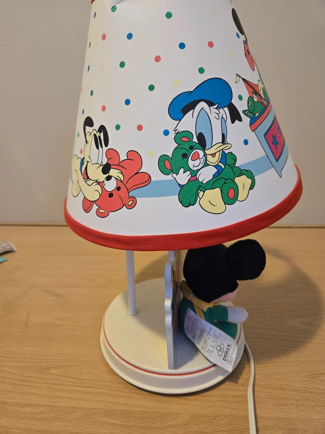 This is a Disney Babies nursery lamp featuring Mickey Mouse. It's designed with colourful cartoon characters on the lampshade and a plush Mickey figure on the base. Made in the USA.