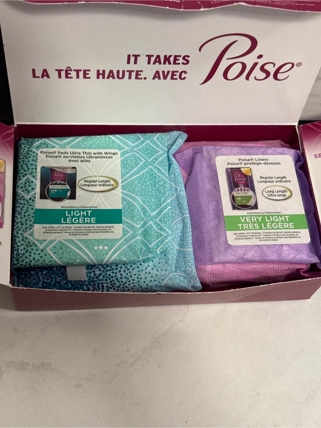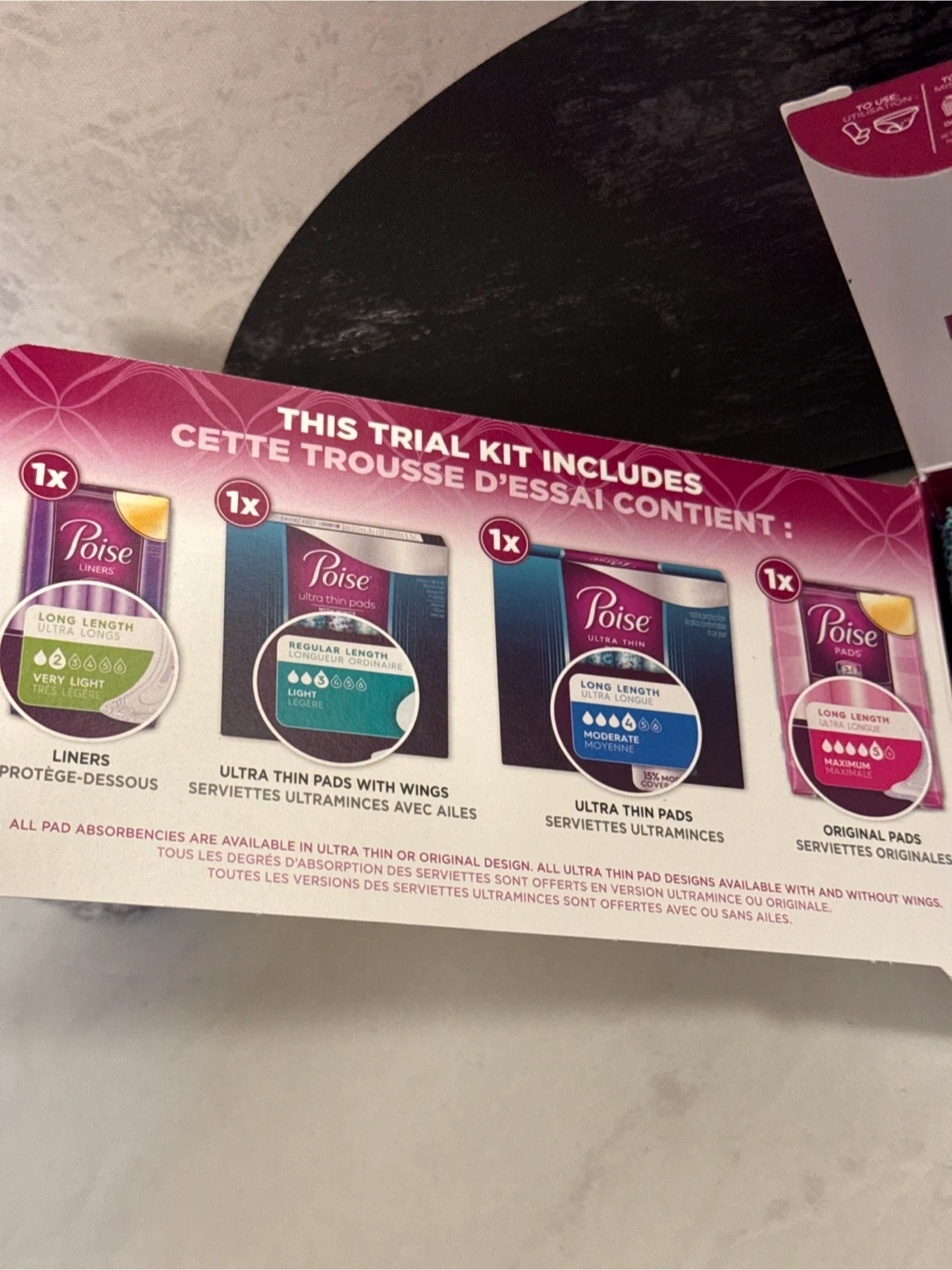 This trial kit includes Poise Liners and Poise Ultra Thin Pads with wings in various absorbencies. It's a great way to sample different products to find what works best for you. All pads and liners are designed for comfort and protection.