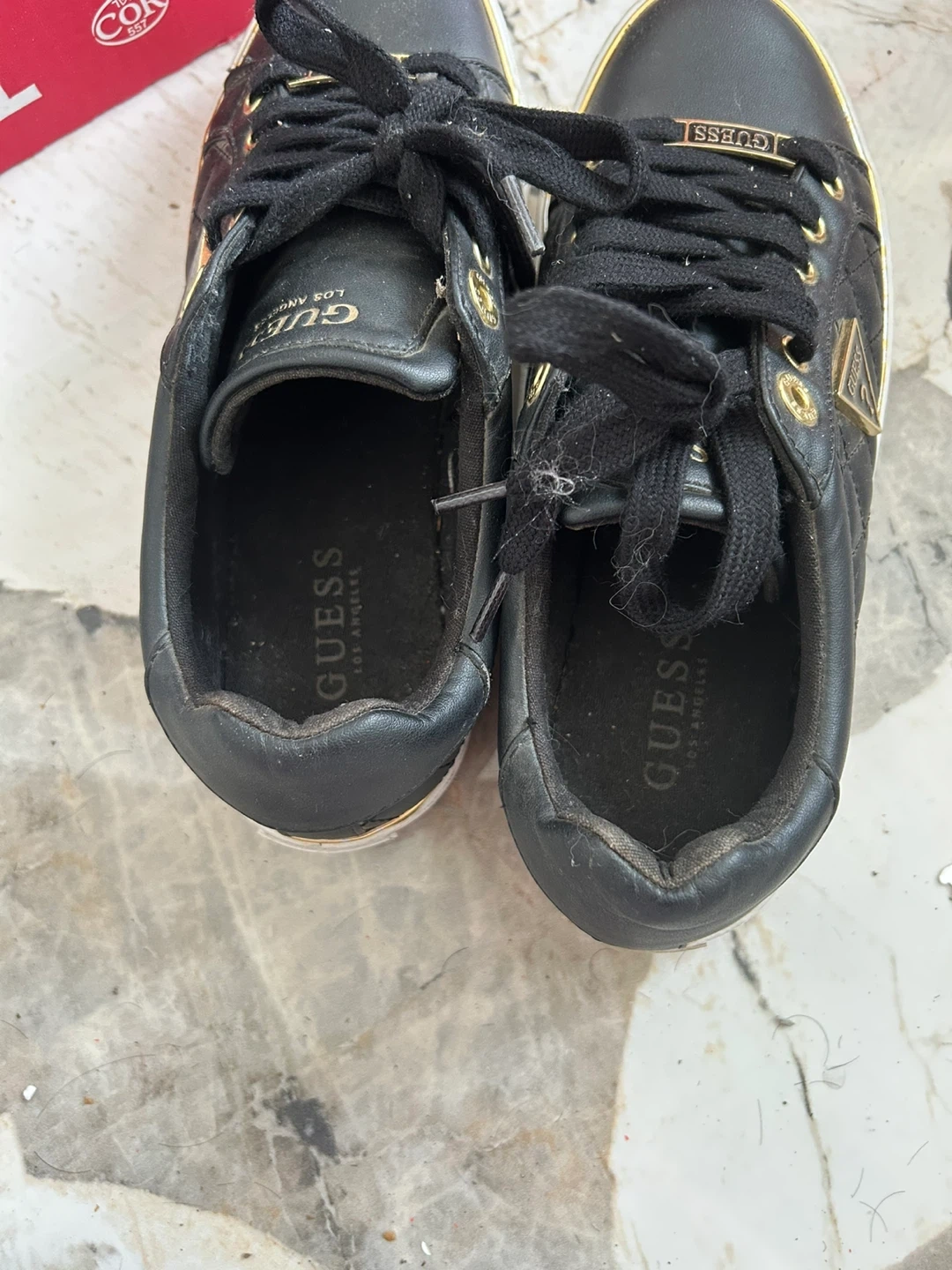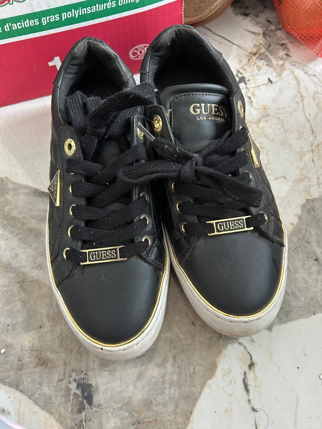 These Guess sneakers are black with quilted detailing and gold accents. They're a women's size 8.5 (US). The material appears to be faux leather.barely use