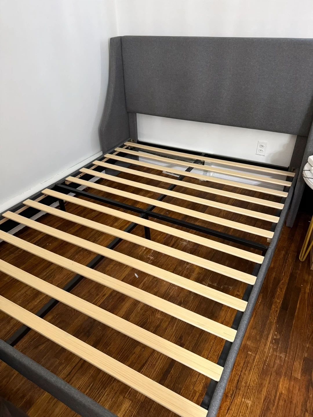 Grey upholstered bed frame with a wingback headboard. Includes wooden slats for mattress support. Queen size.