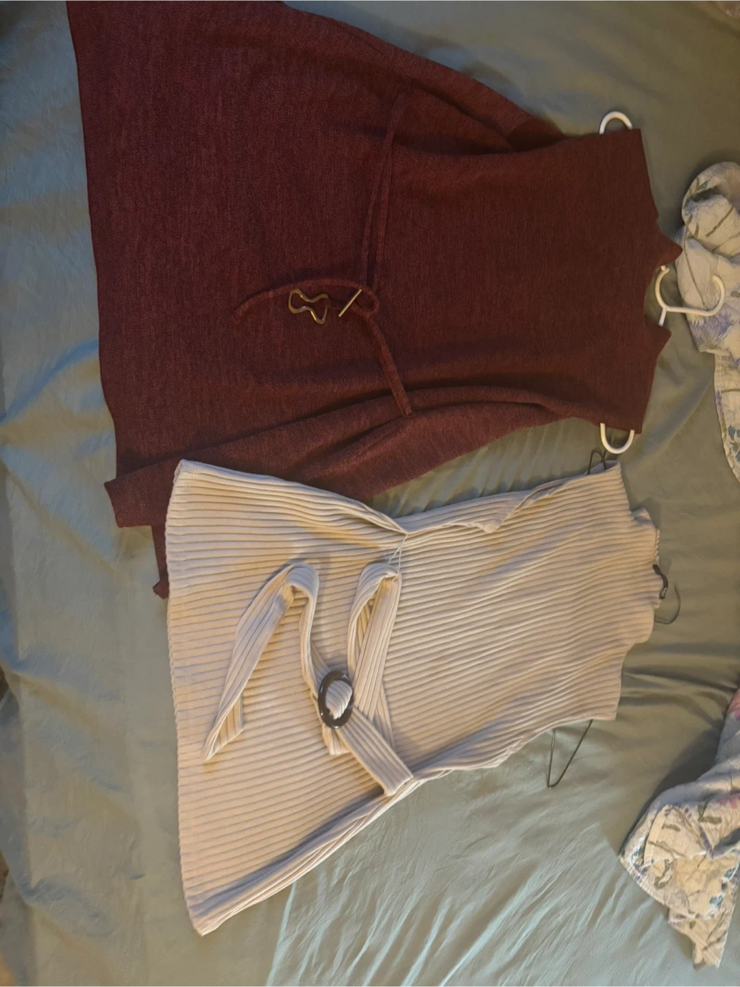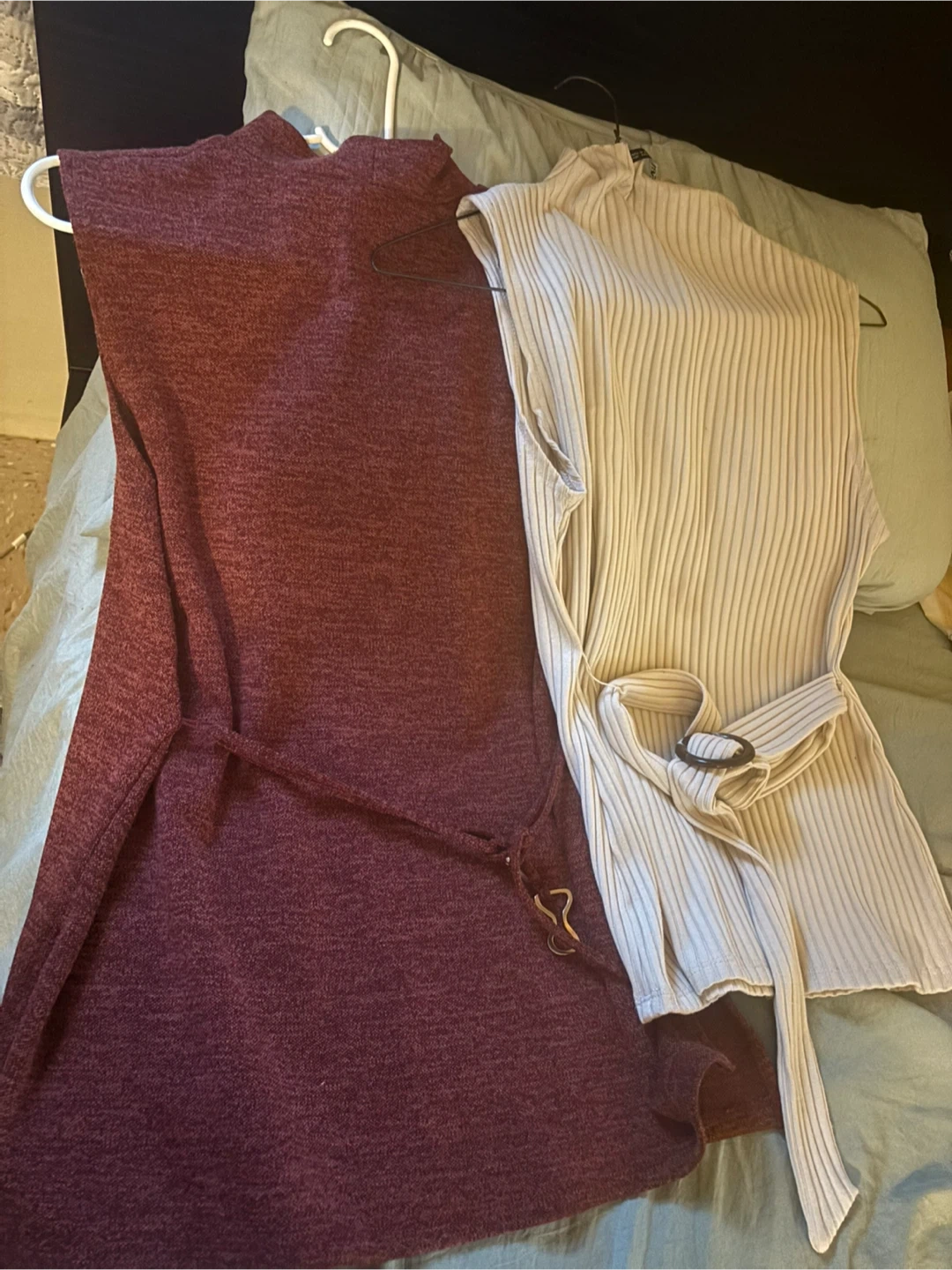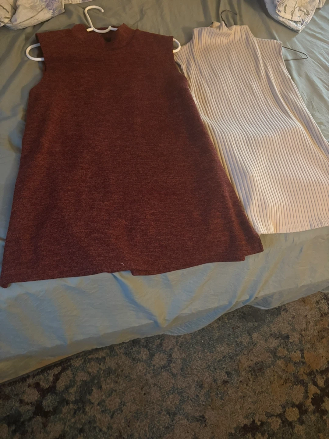 Two sleeveless mock neck tops , one in a burgundy marled knit and the other in a ribbed beige knit. Both include a matching fabric tie belt. Sleeveless design, mock neckline.