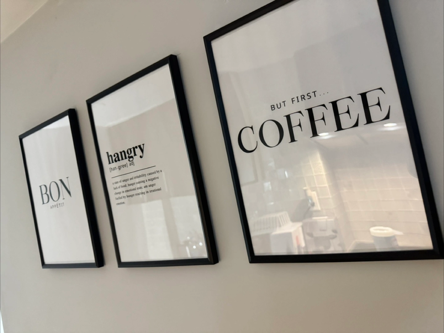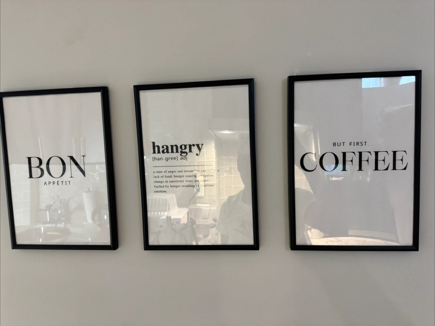 Selling a set of three framed wall art prints. Each print features a different word or phrase in a modern, minimalist style. They would look great in a kitchen or dining area. The prints are in excellent condition and ready to hang!