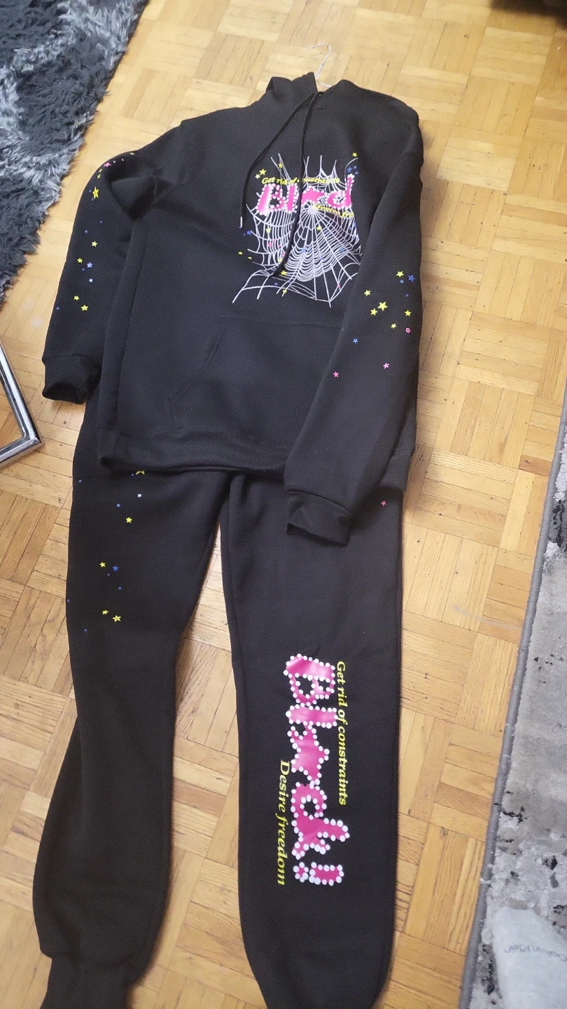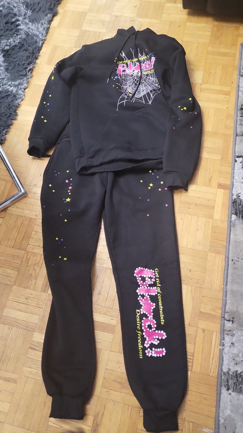 Selling a black hoodie and sweatpants set. The set features a unique design with pink and yellow accents. The hoodie has a spiderweb design on the chest and the sweatpants have the word "Black" down the leg. The material is soft and comfortable, perfect for lounging or casual wear
