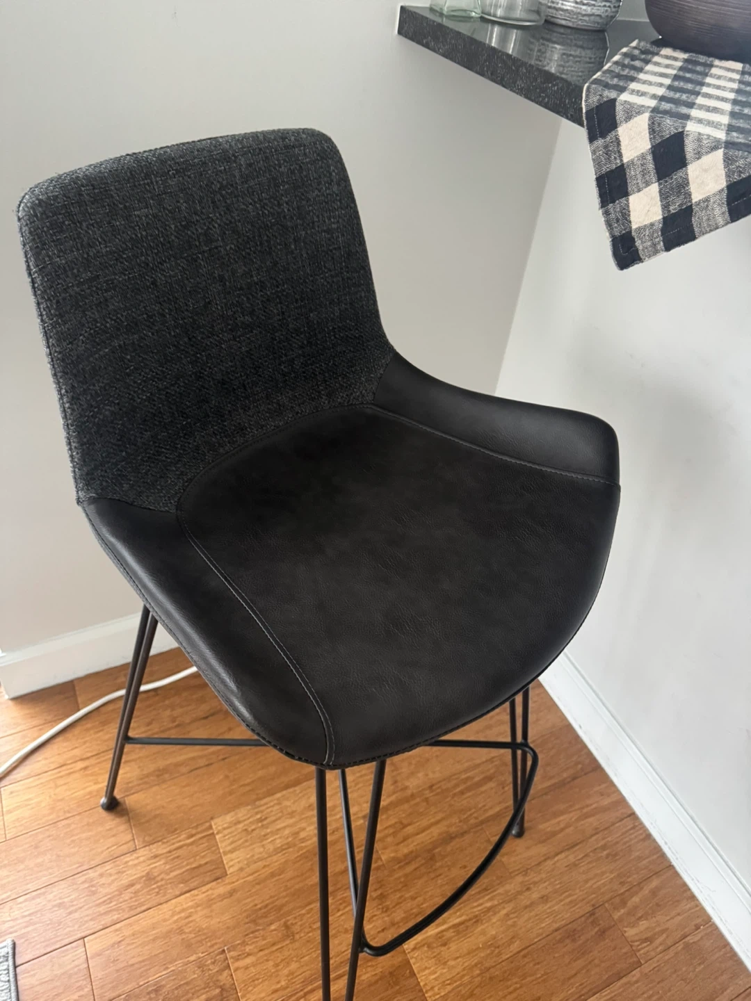 This bar stool features a dark grey textured fabric backrest and a black faux leather seat. Its sleek metal legs offer a modern look. This stool's design makes it a versatile seating option for a kitchen island or home bar.