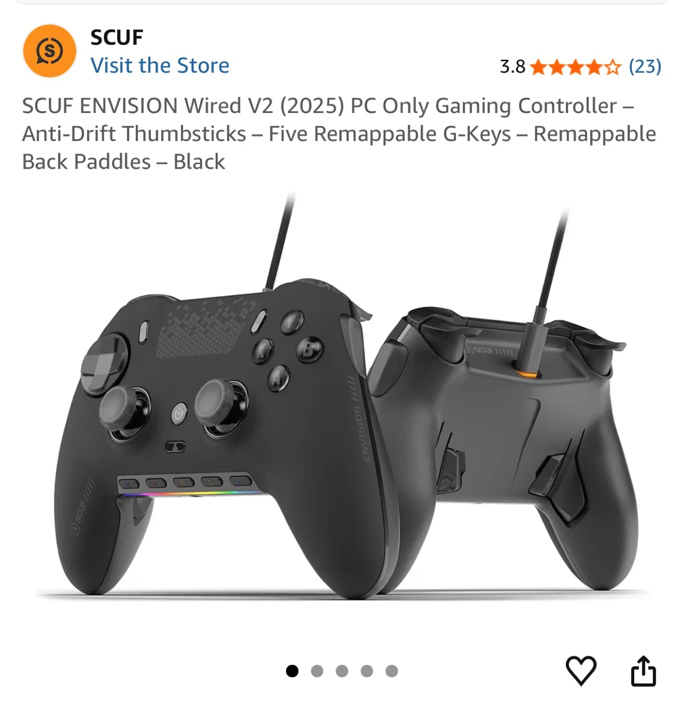 This SCUF ENVISION controller is designed specifically for PC gaming. It features four remappable back paddles and G-Keys for advanced macros. The controller also includes three on-board profiles for custom configurations.