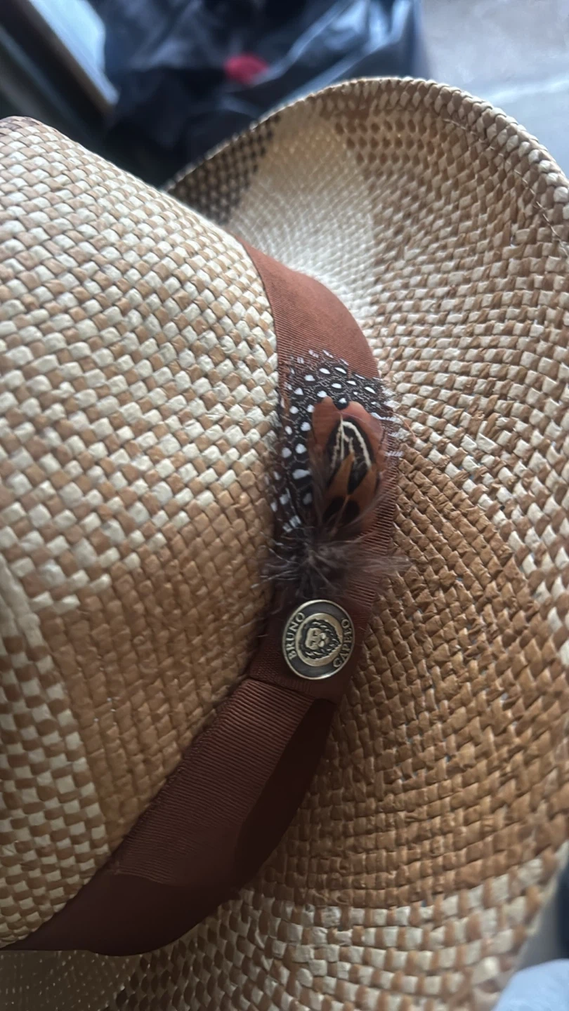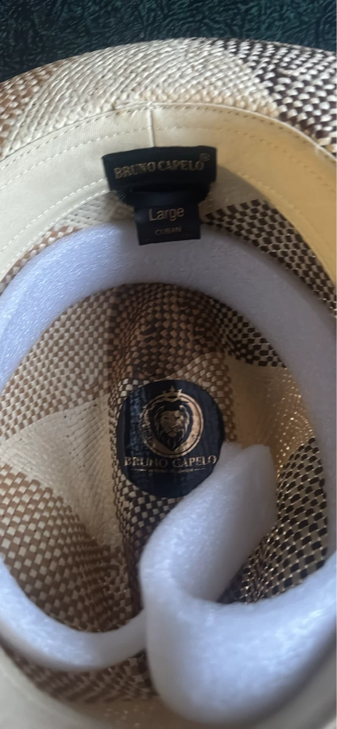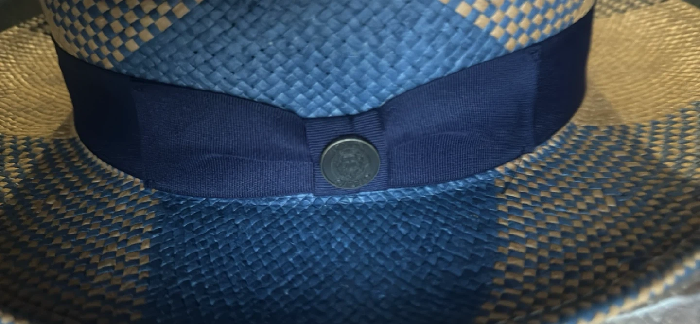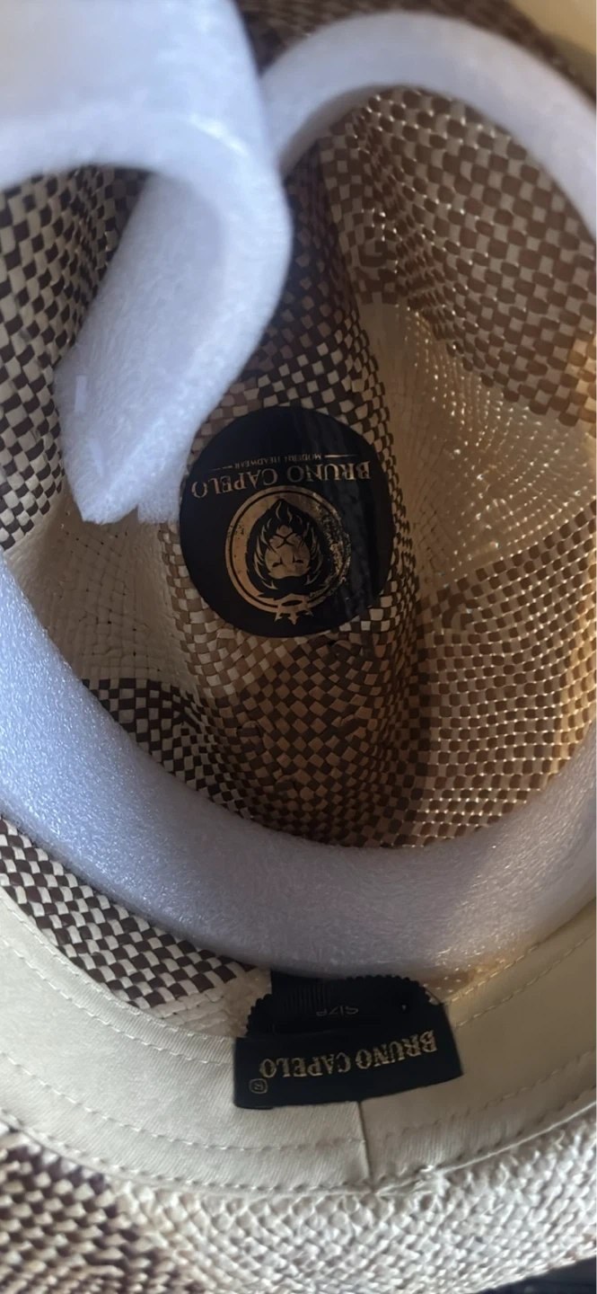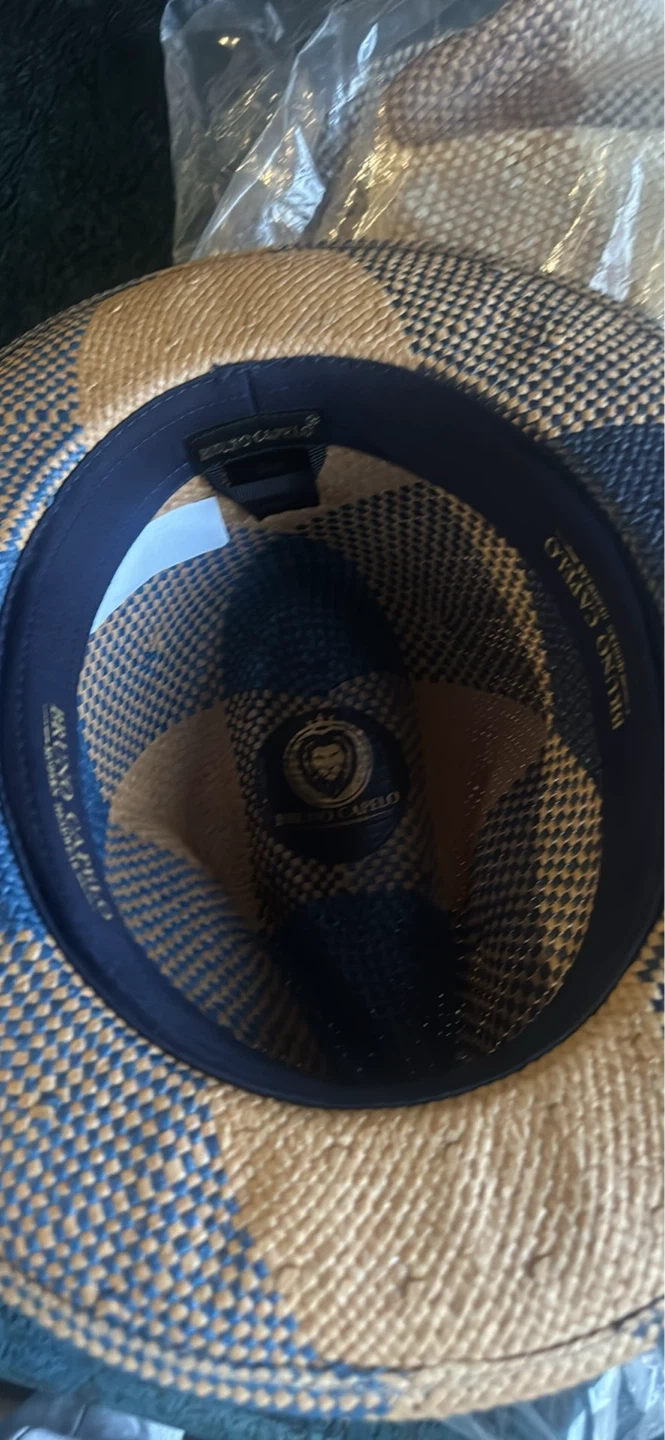 Straw fedora by Bruno Capelo. Features a woven straw construction with a blue checkered pattern and a navy band. Size is large. Perfect for sunny days!