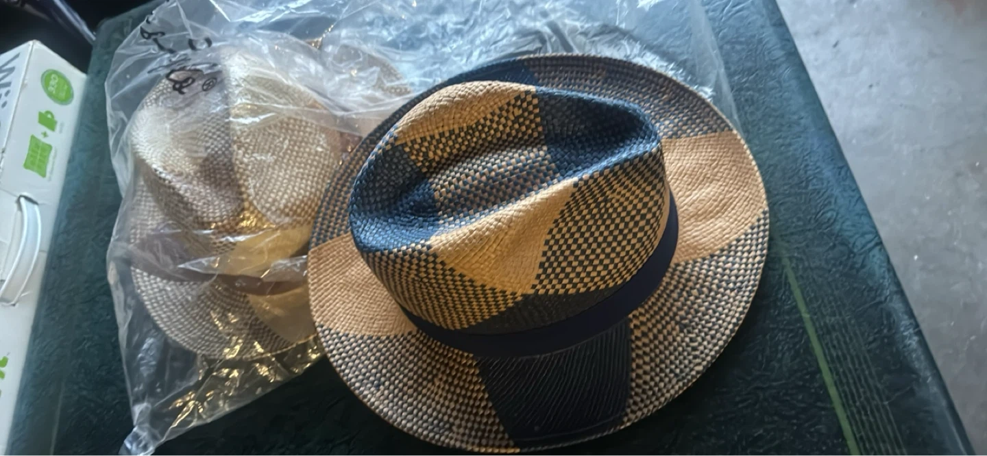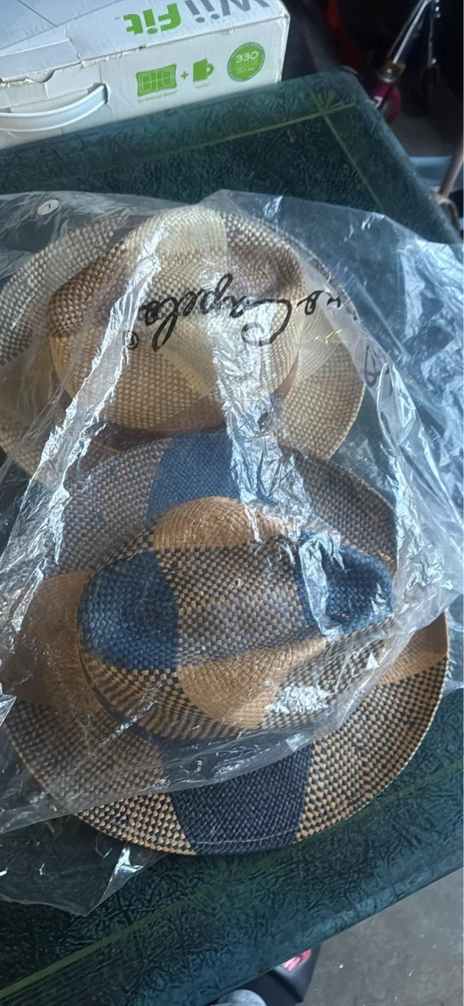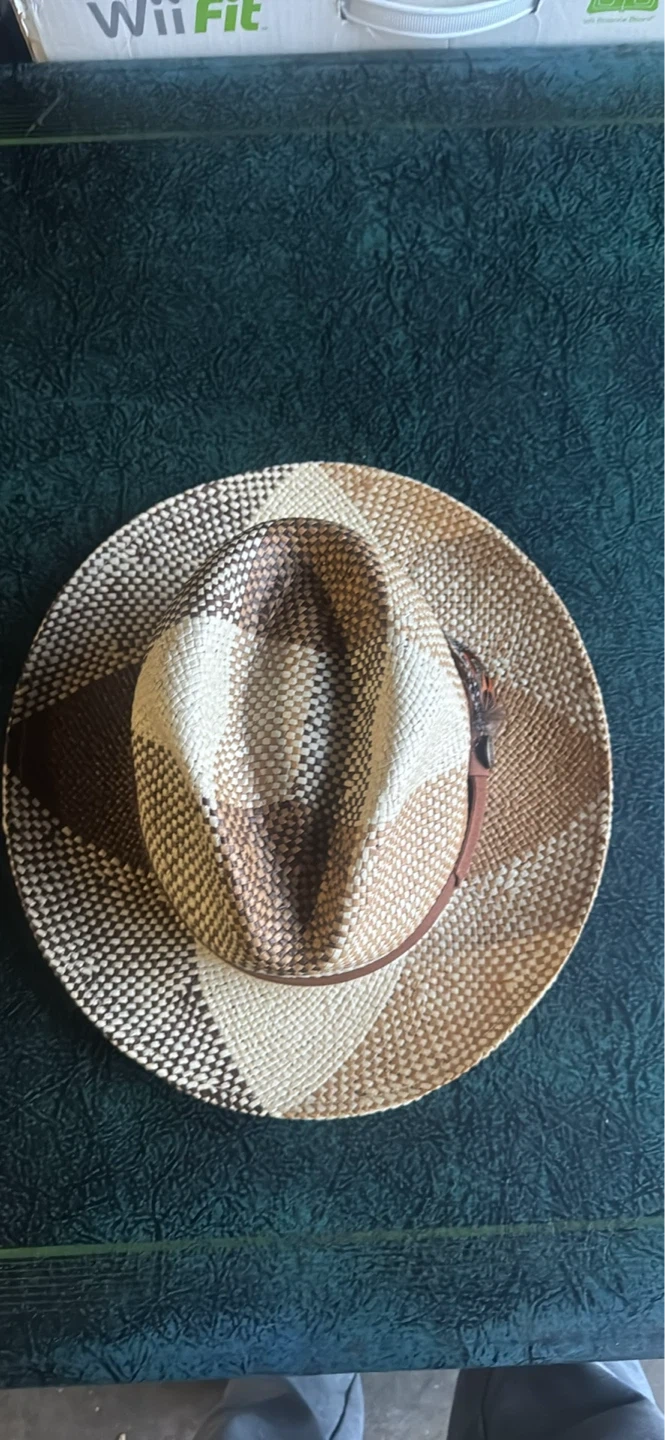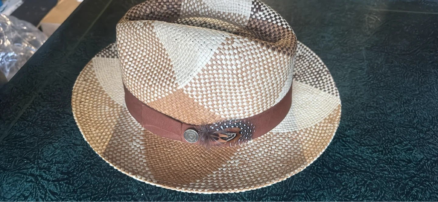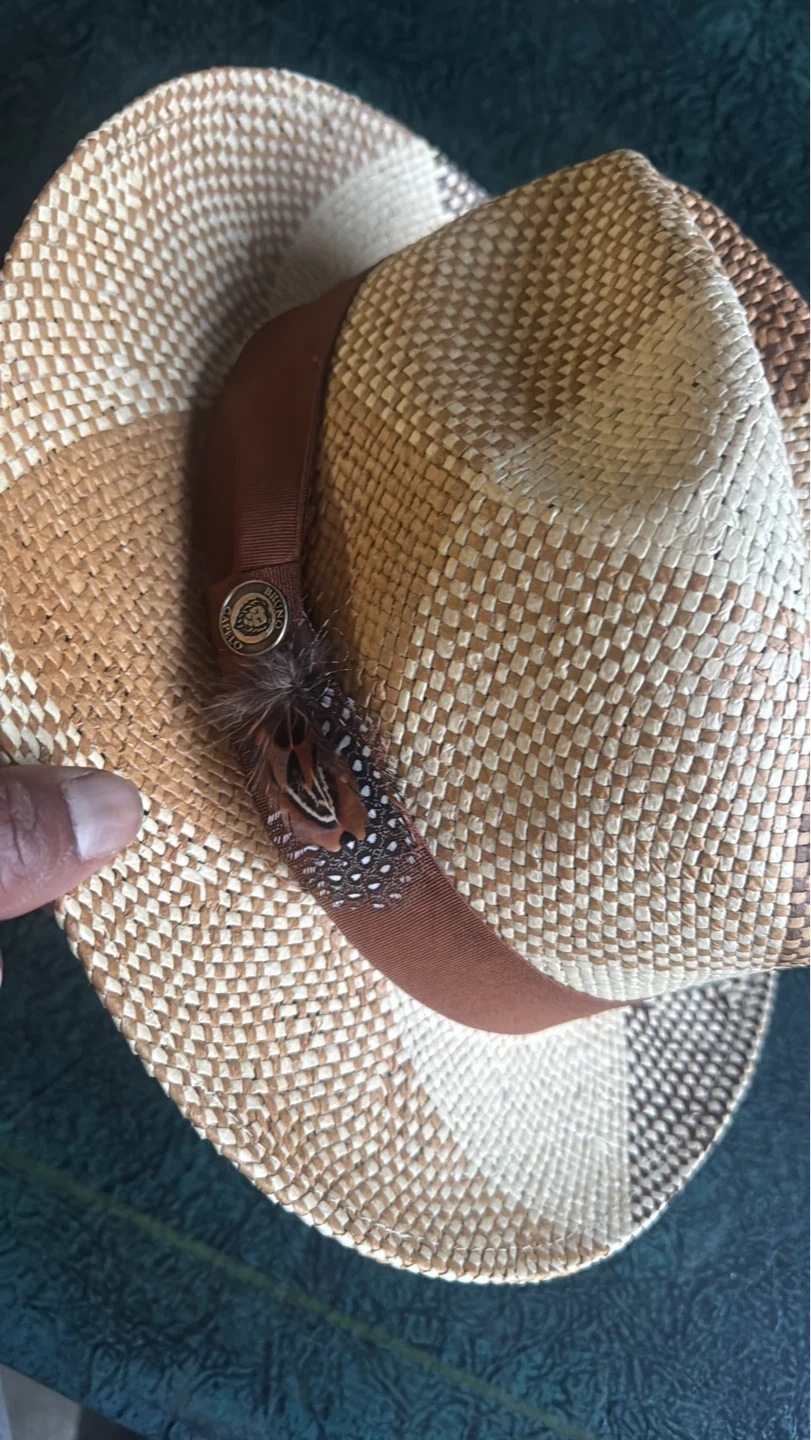 Straw fedora by Bruno Capelo. Features a woven straw construction with a blue checkered pattern and a navy band. Size is large. Perfect for sunny days!