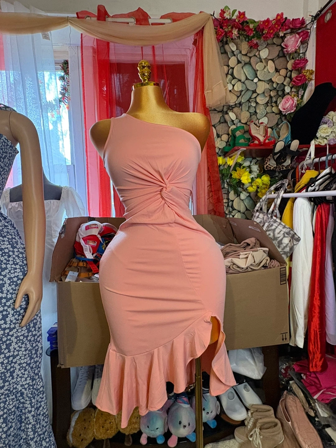 153This is a cute peach-colored dress with a one-shoulder design and a ruffle at the bottom. It has a knot detail on the side. It's perfect for a night out or a special occasion!